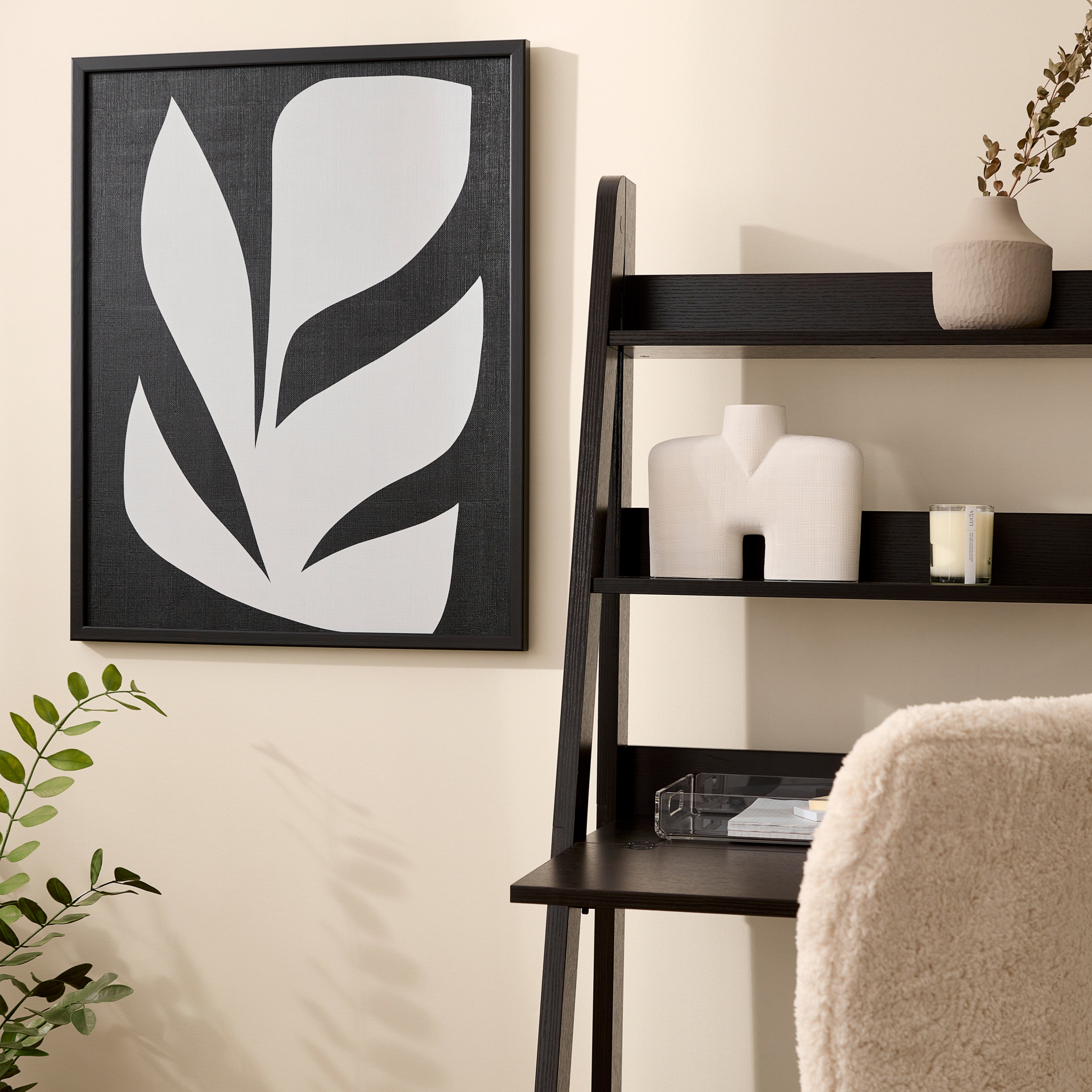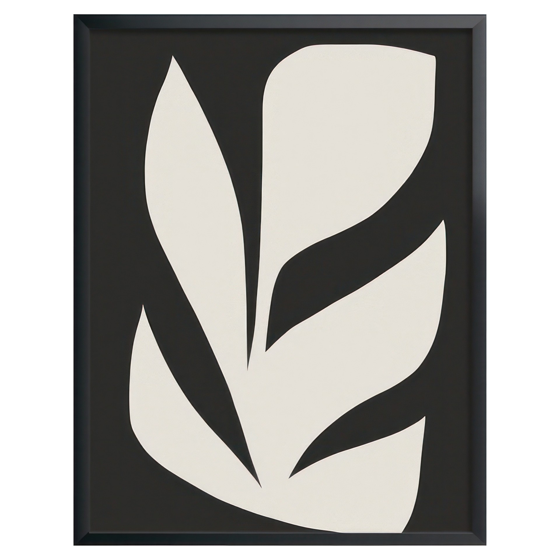 Cette œuvre épurée impressionne par son contraste saisissant entre le noir profond et le blanc crème. Sa forme organique évoque une feuille stylisée, apportant une touche de nature abstraite et contemporaine à votre décor.