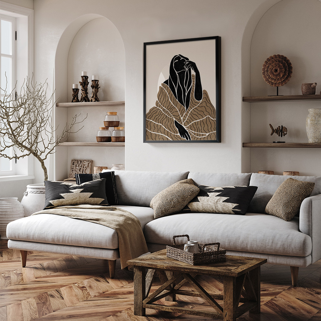 Cette œuvre saisissante capture l'émotion humaine avec profondeur et délicatesse. La silhouette féminine stylisée en noir contraste magnifiquement avec les motifs organiques beiges, créant une composition visuellement riche qui évoque introspection et vulnérabilité.
