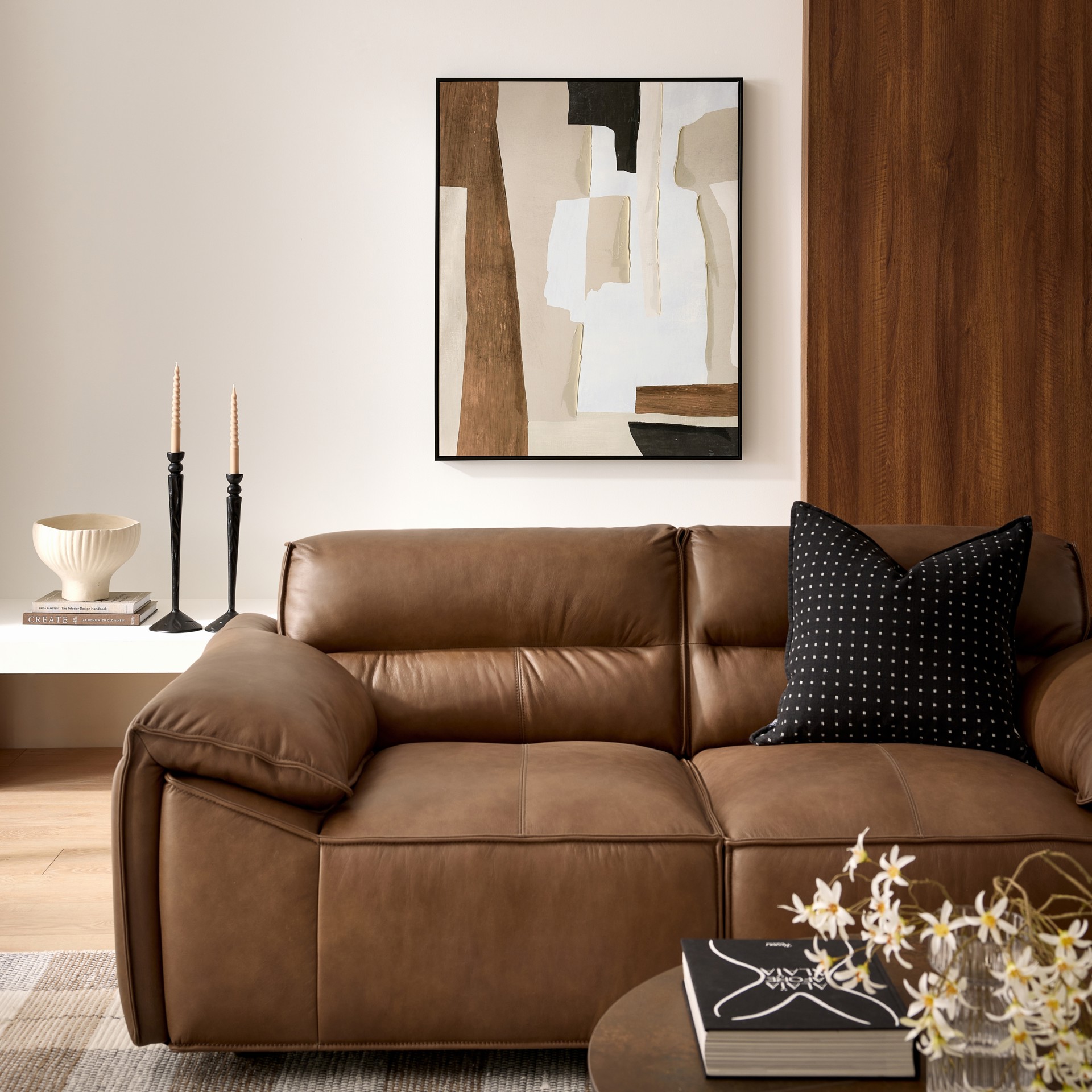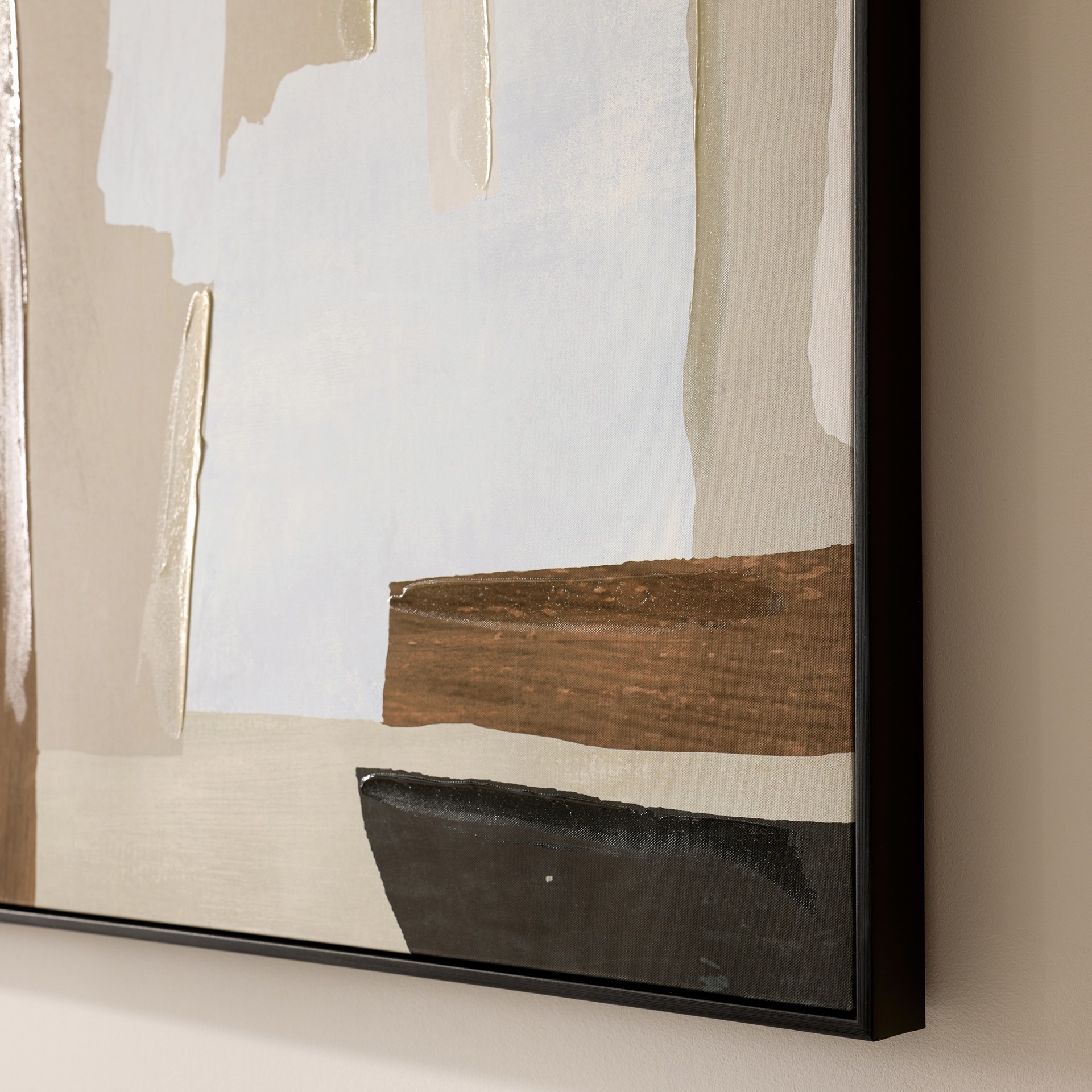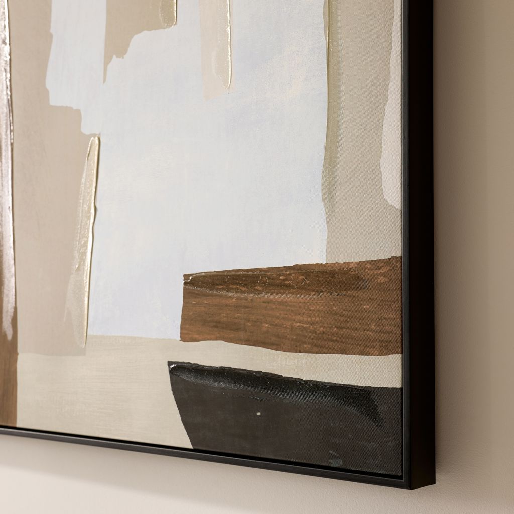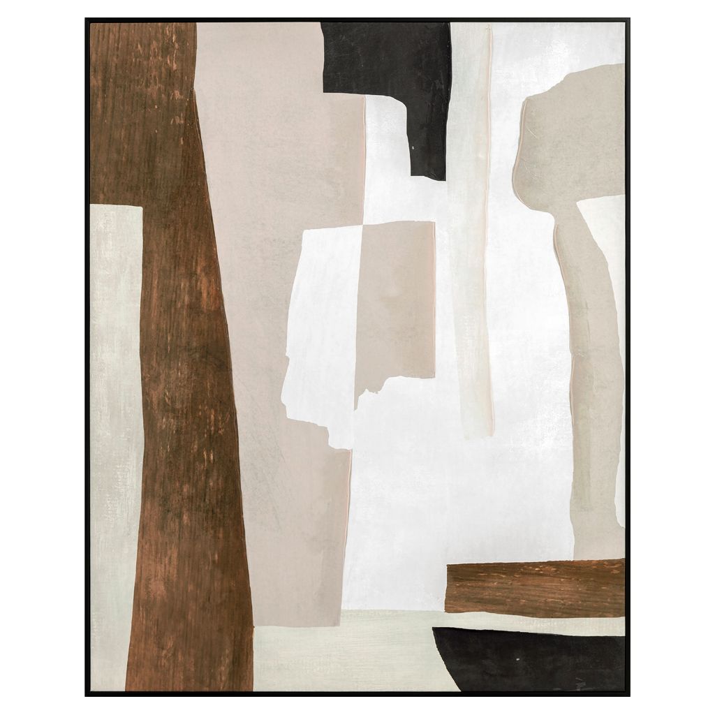 Ce tableau propose une composition abstraite élégante, où des formes organiques et géométriques se superposent dans des tons naturels. Les nuances de beige, brun et noir créent un équilibre visuel apaisant et moderne.