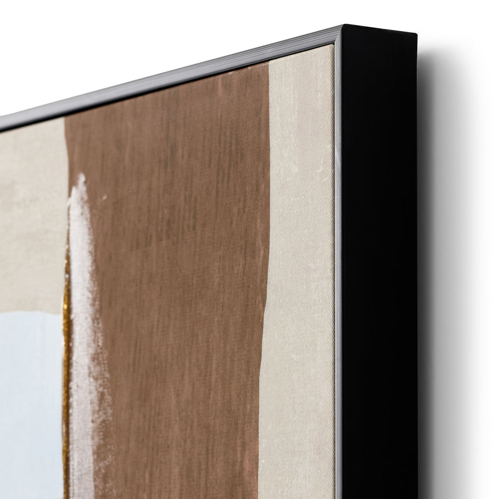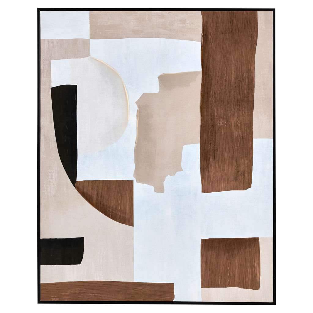 Ce tableau propose une composition abstraite élégante, où des formes organiques et géométriques se superposent dans des tons naturels. Les nuances de beige, brun et noir créent un équilibre visuel apaisant et moderne.