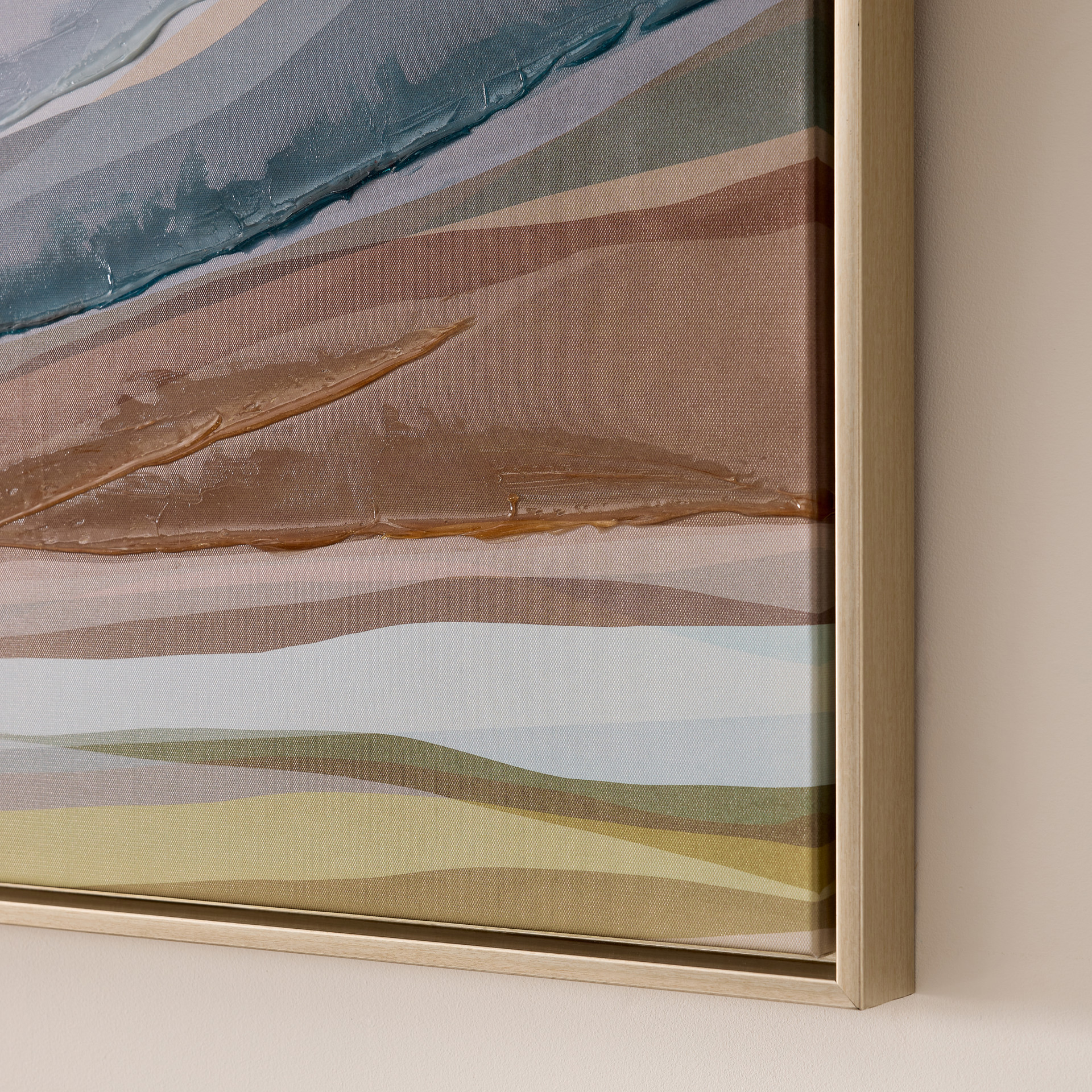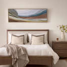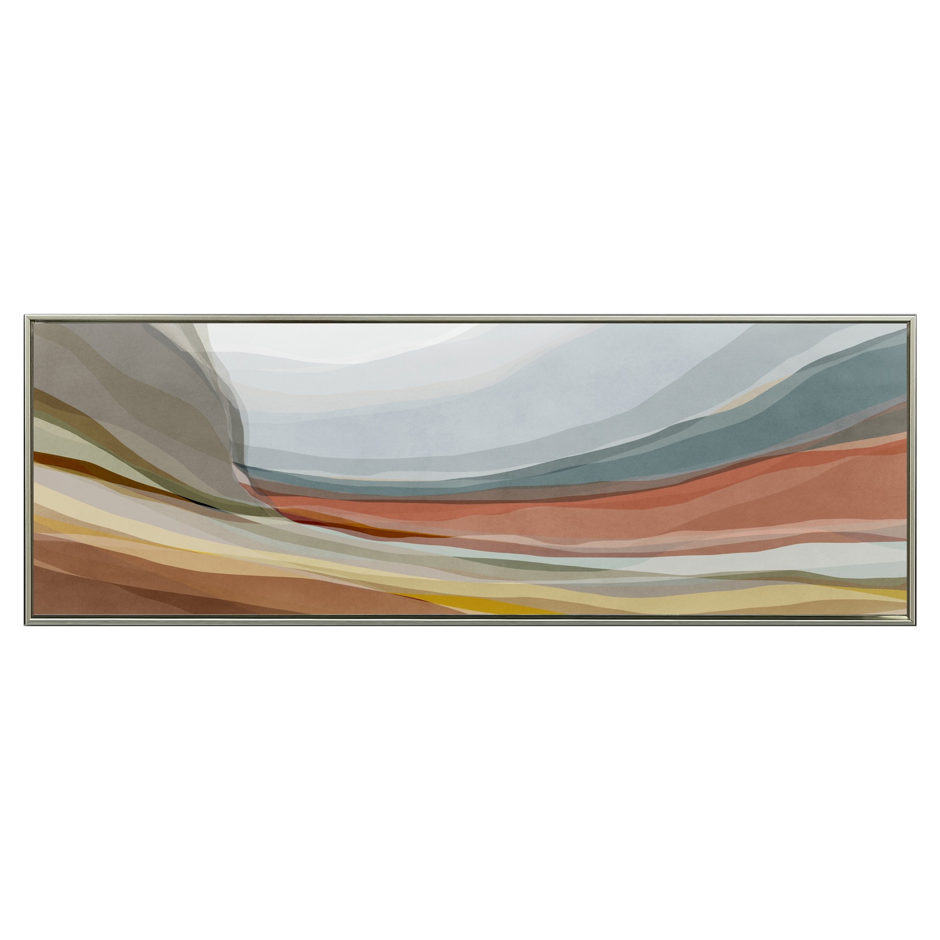 Ce tableau panoramique met en valeur un paysage abstrait composé de couches colorées superposées. Ses tons terreux, bleutés et doux créent une ambiance chaleureuse et enveloppante. L’effet de profondeur attire le regard et apporte une touche artistique apaisante à votre espace.