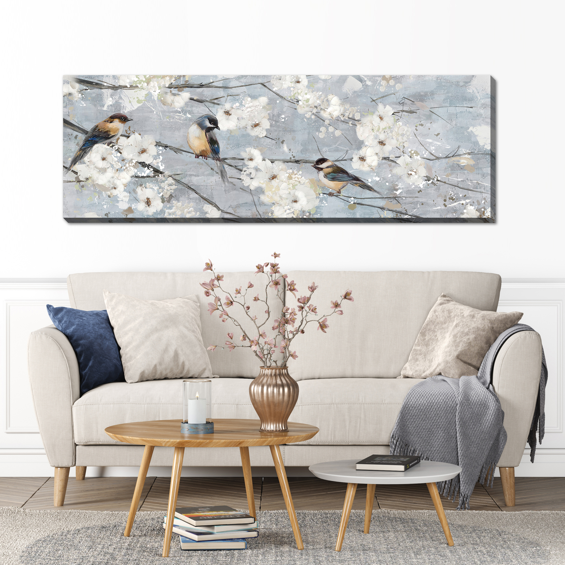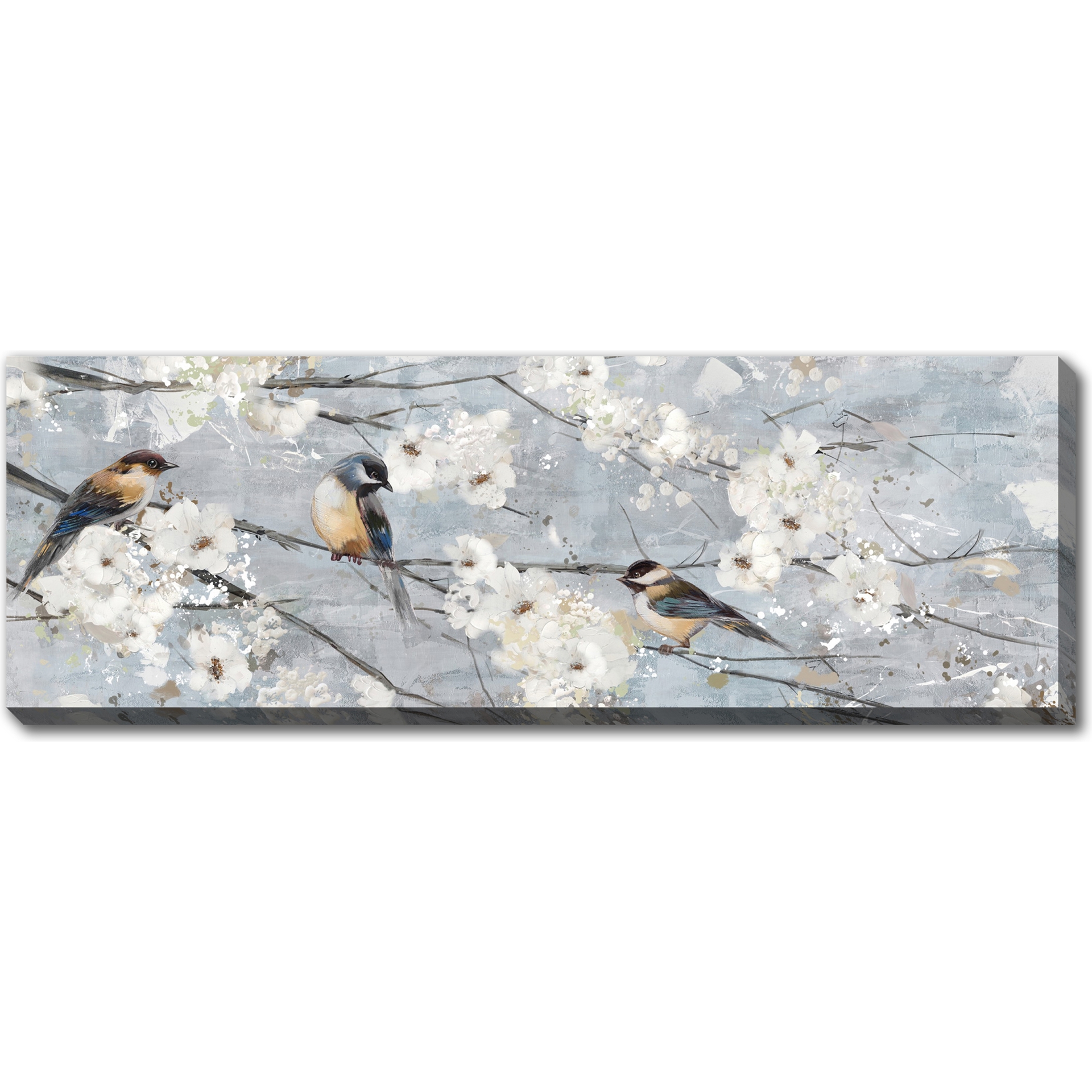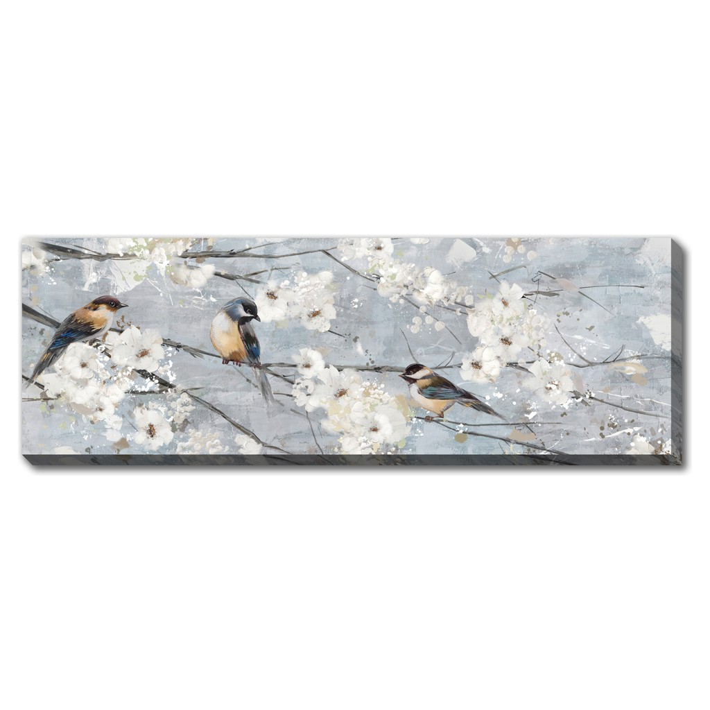 Ce tableau propose une scène délicate où trois oiseaux se posent sur des branches ornées de fleurs pâles. Les couleurs douces et la finesse des détails créent une ambiance apaisante et lumineuse.