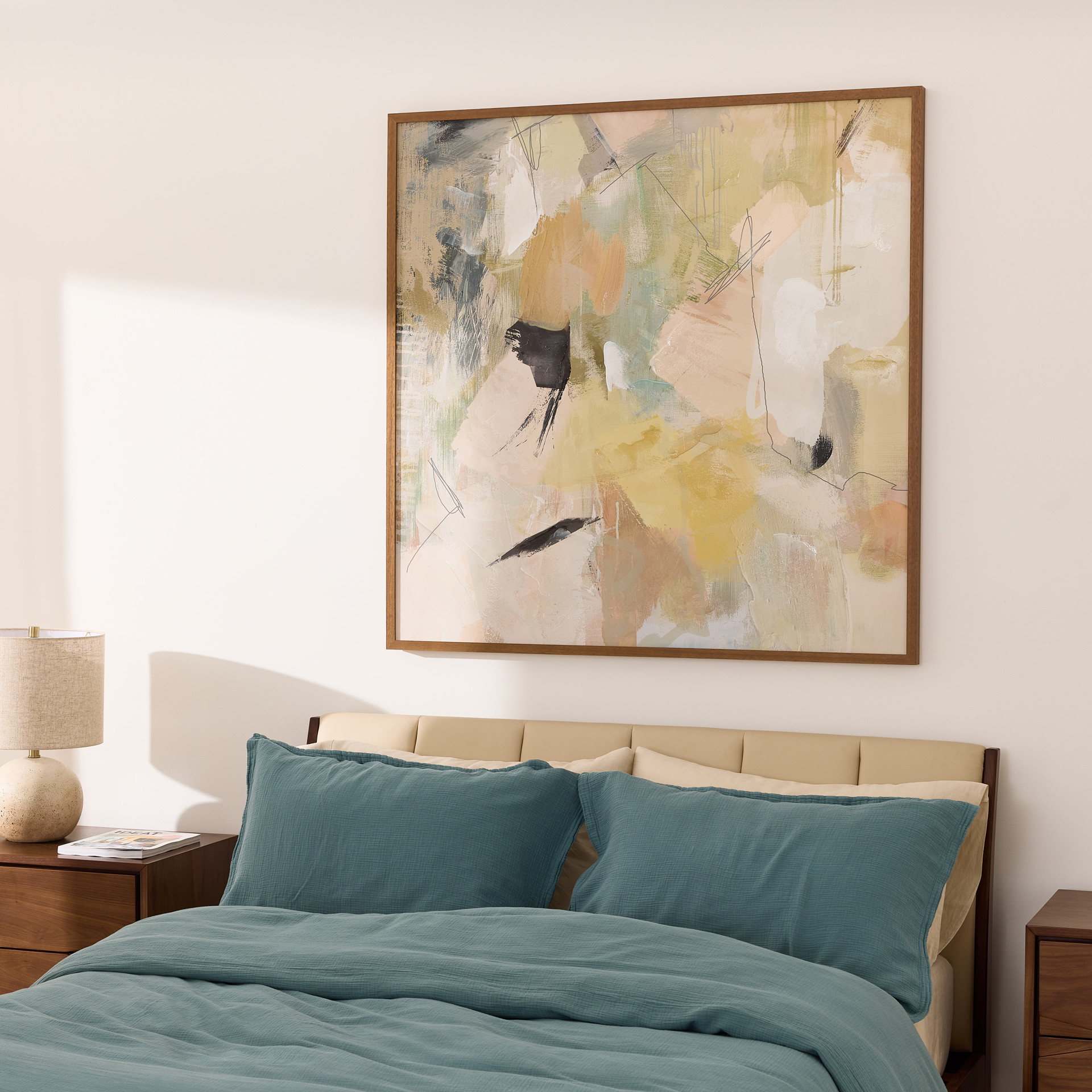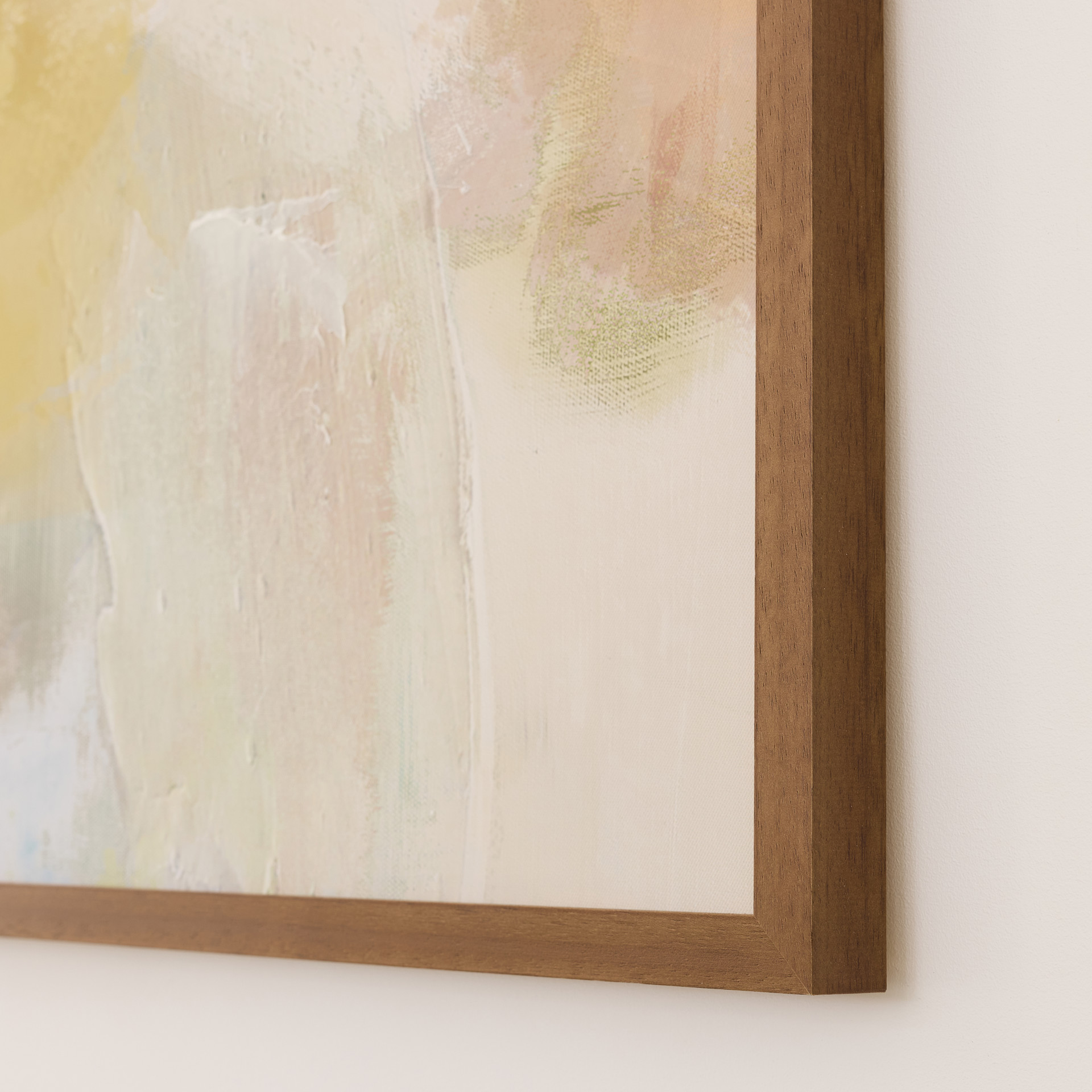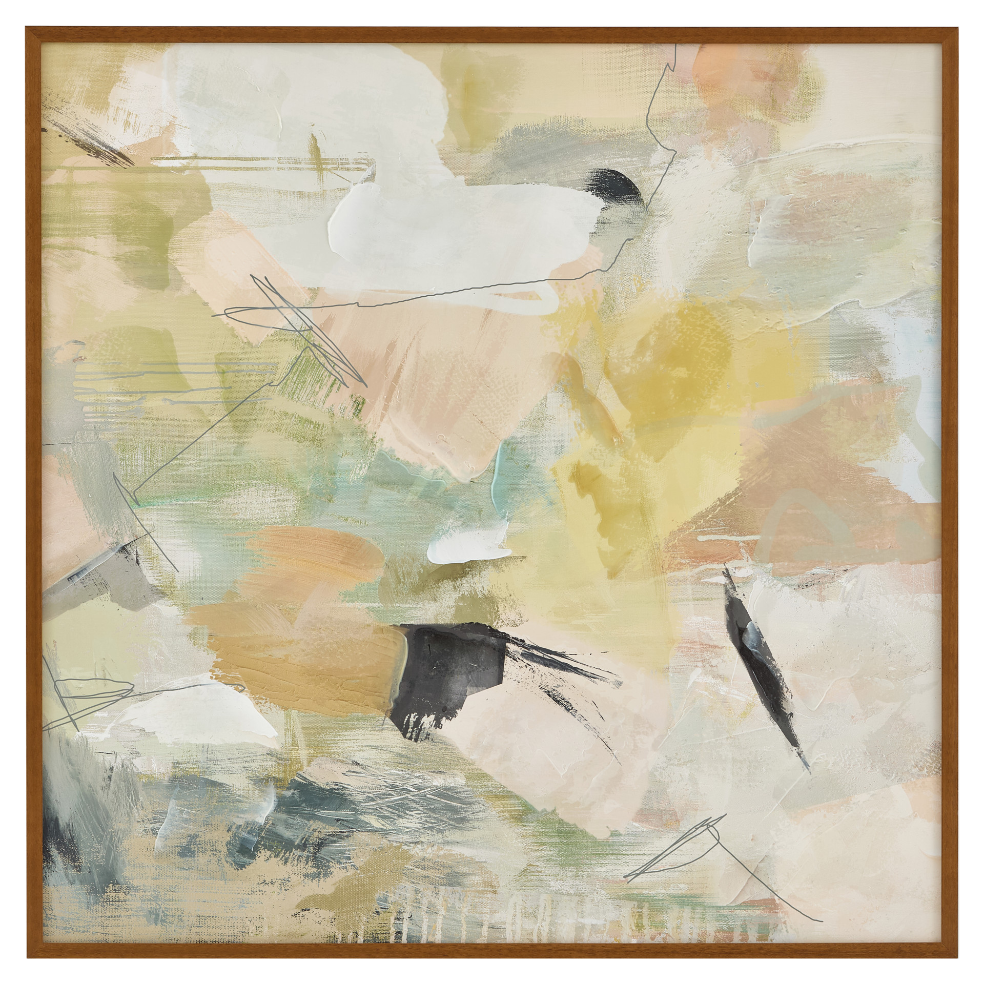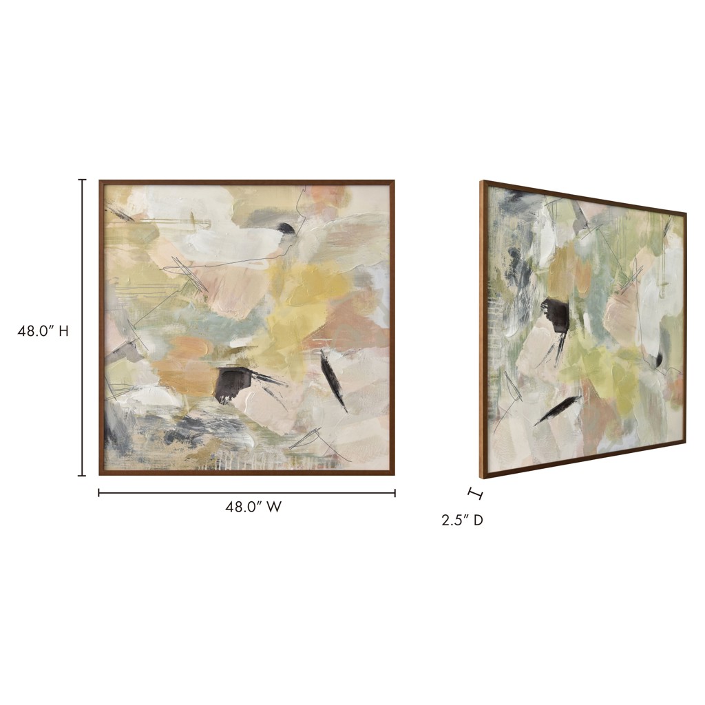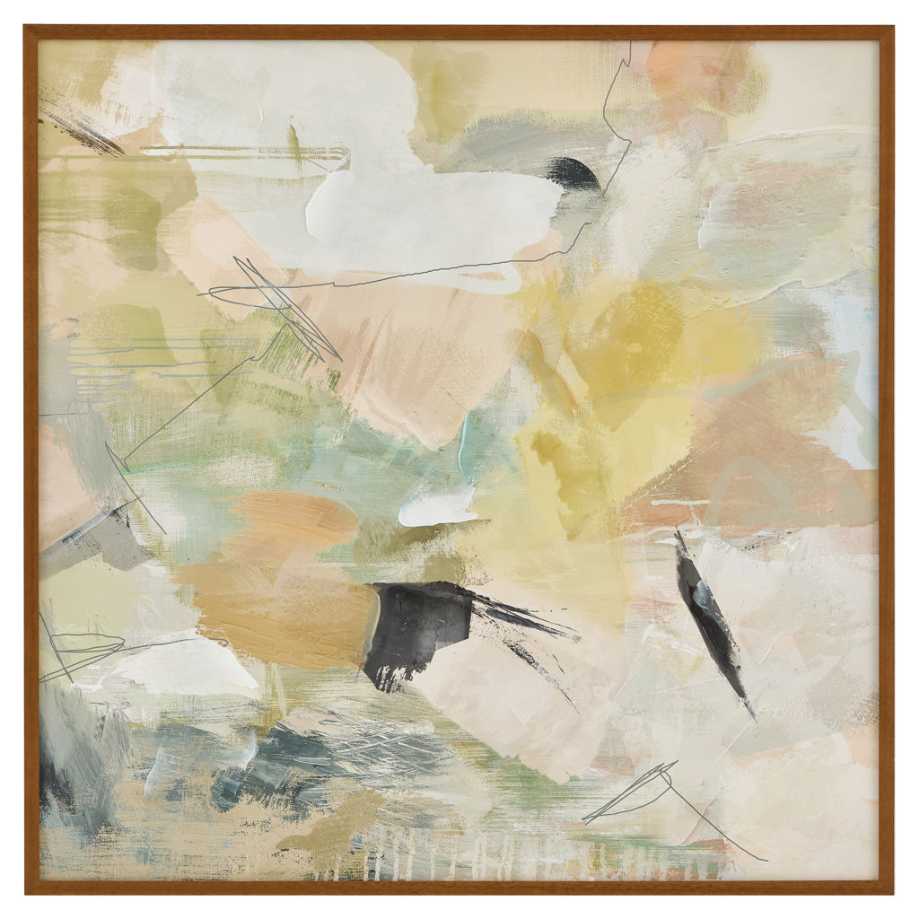 Serendipity brouille les pastels doux et atténués avec des nuances noires plus graphiques, tandis que les tons doux ajoutent une sensation de sérénité et de tranquillité à la pièce abstraite. La finition marron chaud du cadre en pin massif souligne la présentation avec une touche vintage.