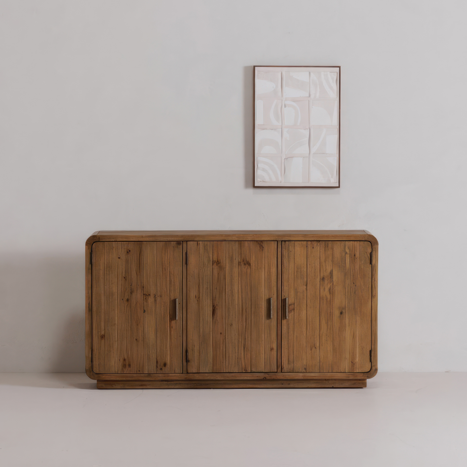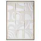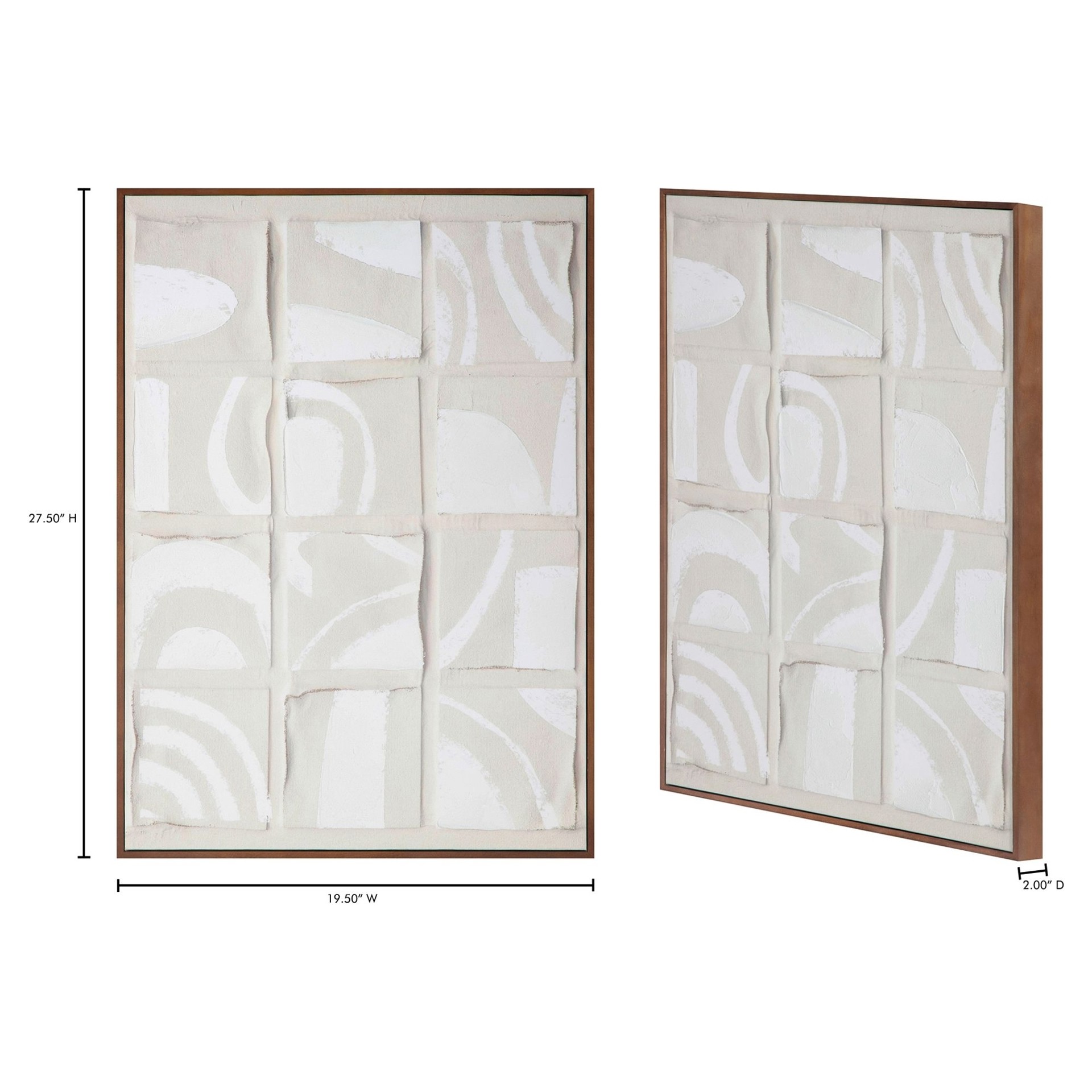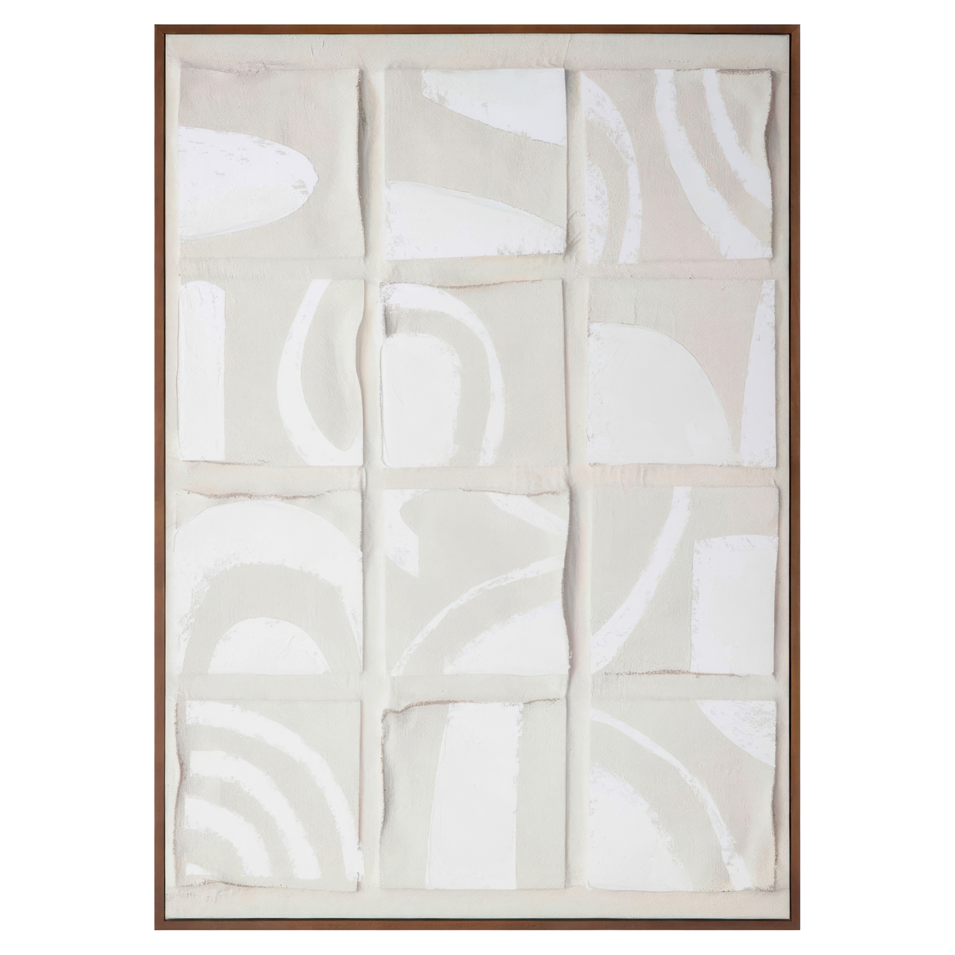 Les tons ombrés ajoutent de la profondeur et de la dimension aux carrés de type collage, tandis qu'une palette de couleurs neutres et des formes irrégulières offrent une douceur aux formes nettes : une pièce abstraite remarquable finie de manière experte avec un cadre en pin massif.