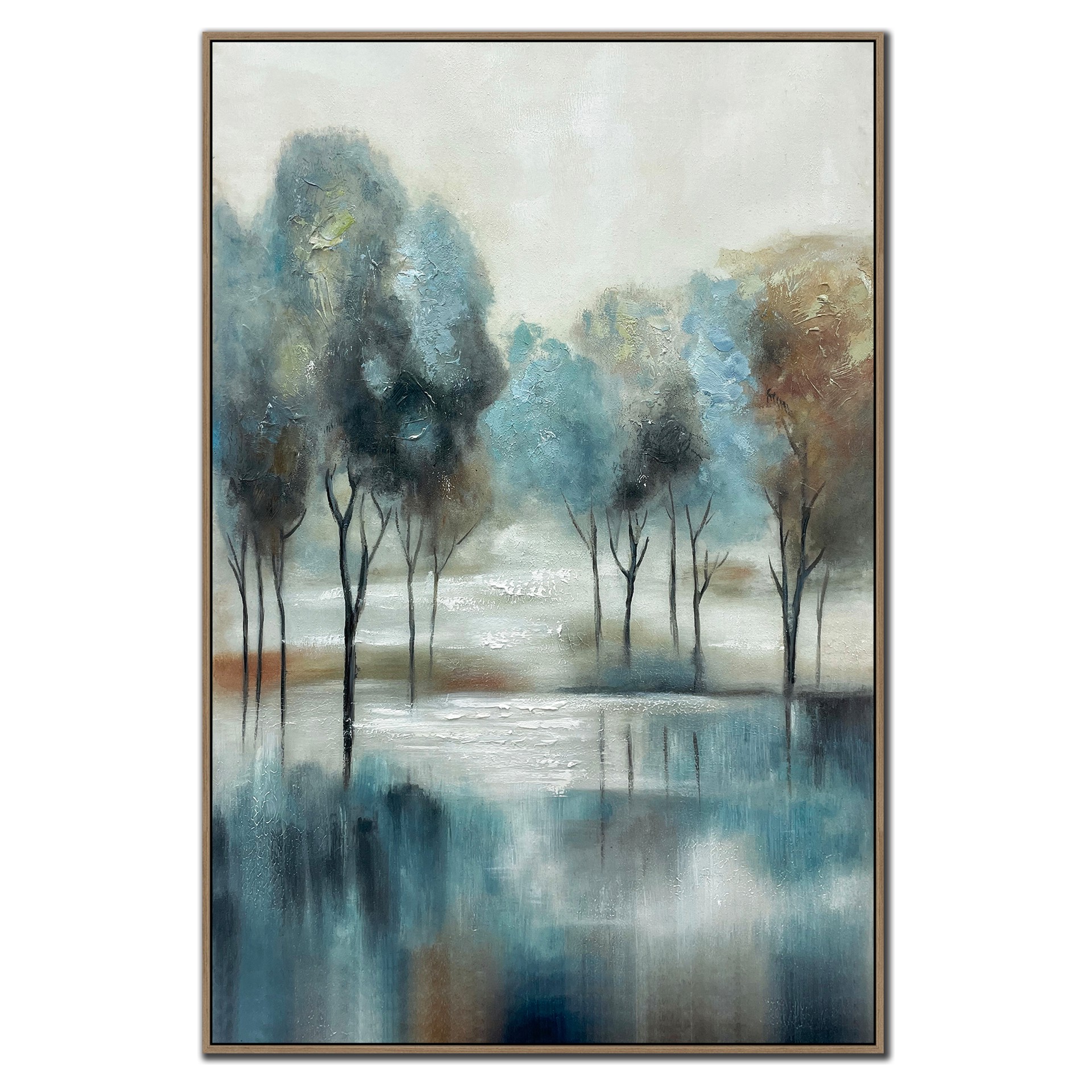 Toile embellie à la main avec beaucoup de texture et son cadre en bois de couleur chêne.