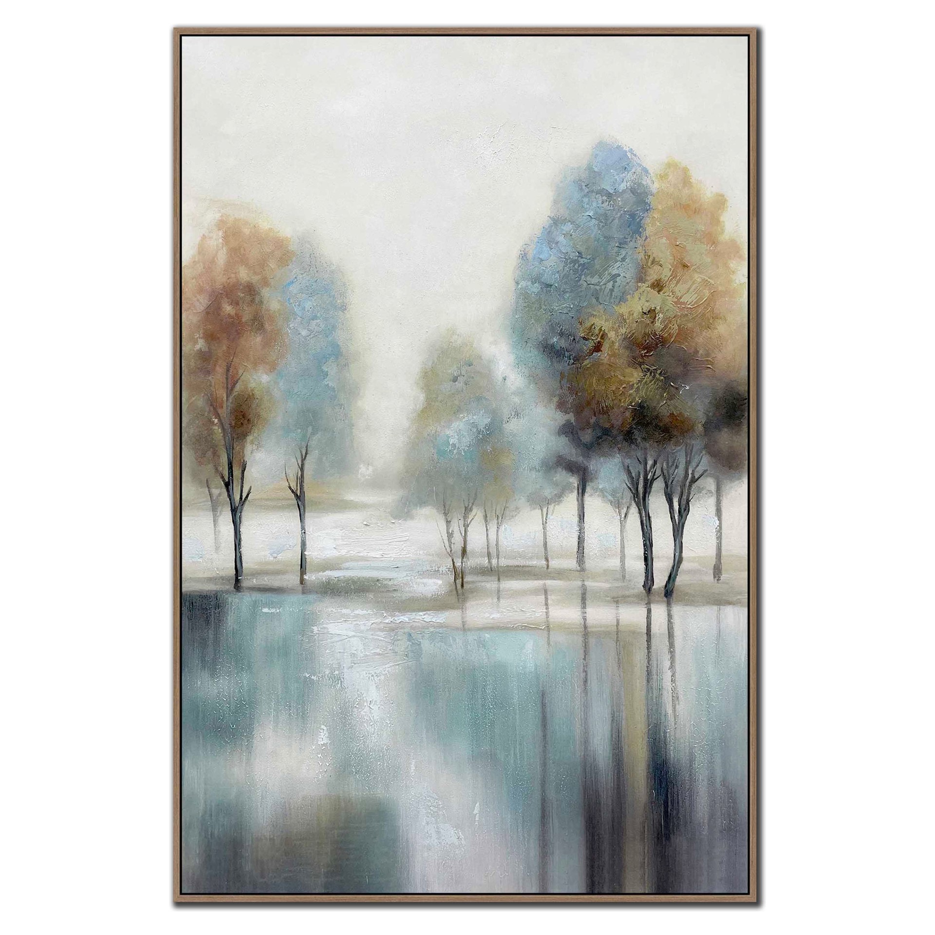 Cette œuvre d'art, qui représente des arbres au bord d'un lac paisible, combine des éléments de la nature avec une qualité onirique.