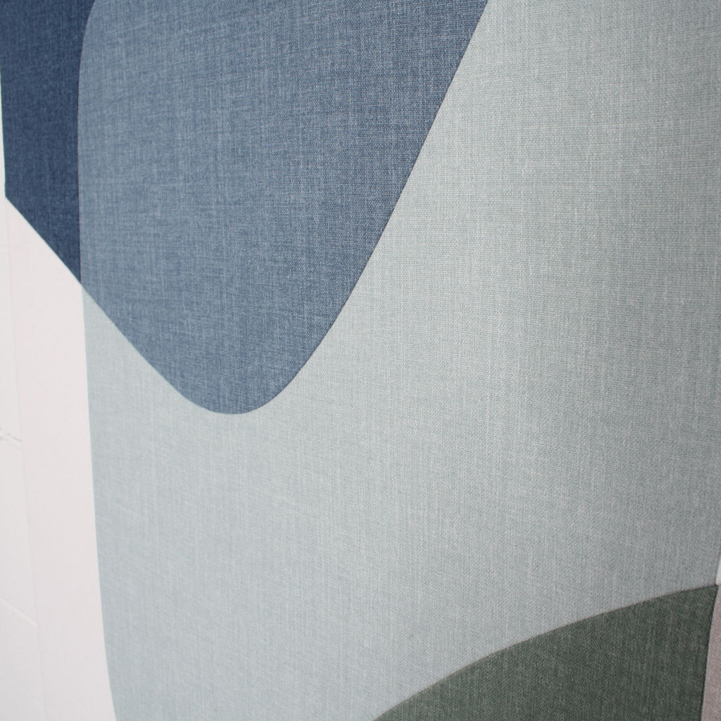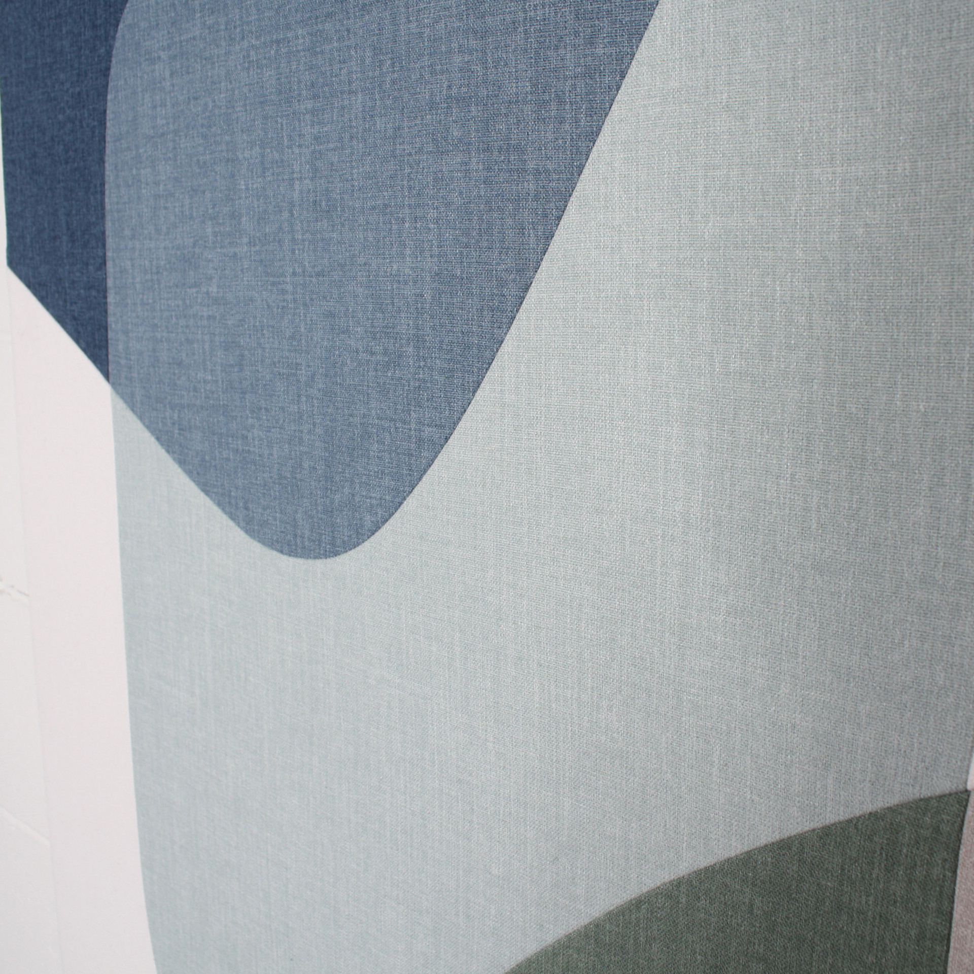 Le tableau INTERACTION est une composition géométrique aux formes organiques, dans les tons pastel. Le dessin est composé de formes en tissu taillées, cousues et assemblées à la main.