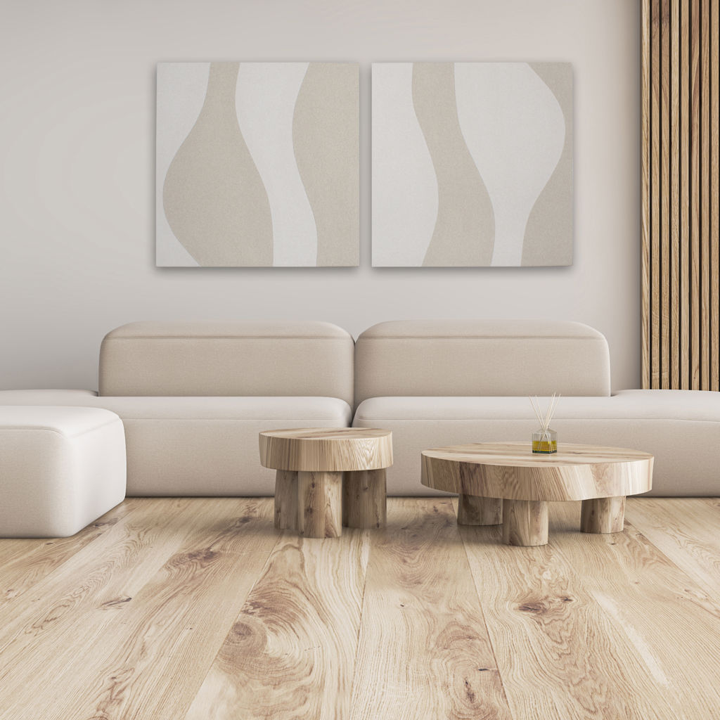 La murale est composée de 2 tableaux de format 30 x 30 po, pour un total d'environ 61 x 30 po, car vous laisserez un espace minimum de 1 po entre chaque tableau.