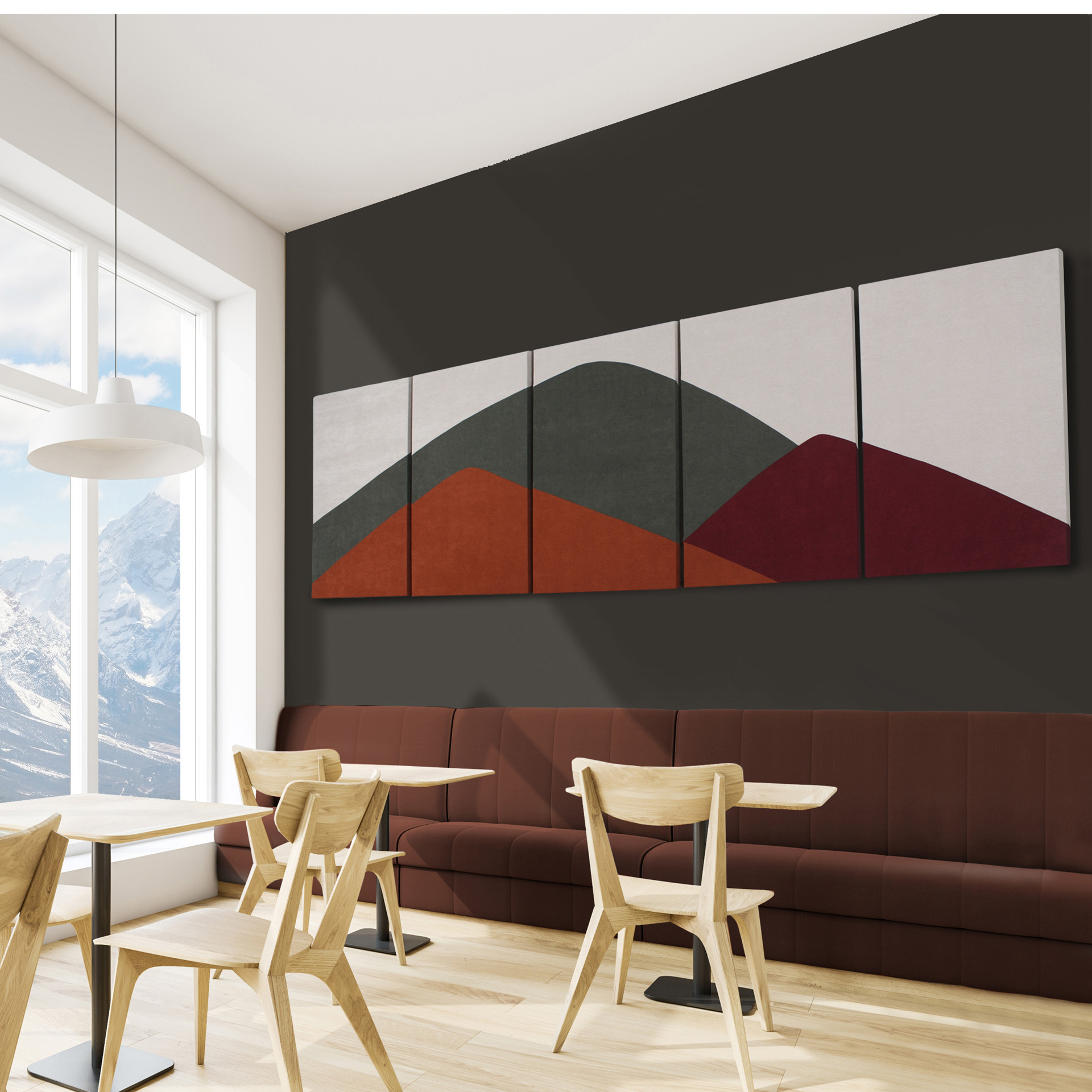 La murale BORÉALE est une composition de 5 tableaux qui évoque la montagne. Ses tons de vert, orange et framboise nous amène la nature dans notre intérieur.