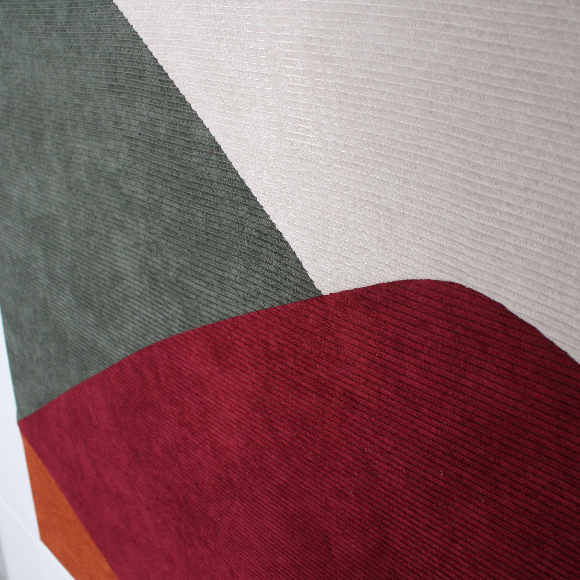 Chaque tableau est fabriqué sur demande en atelier à Québec et signé par l'artiste. Le tissu utilisé pour ce tableau est le CORDUROY, texture côtelée et veloutée.La murale est composée de 5 tableaux de format 24 x 36 po, pour un total d'environ 124 x 36 po, car vous laisserez un espace minimum de 1 po entre chaque tableau. Elle est aussi disponible dans le format 30 x 45 po pour un total d'environ 154 x 45 po.
