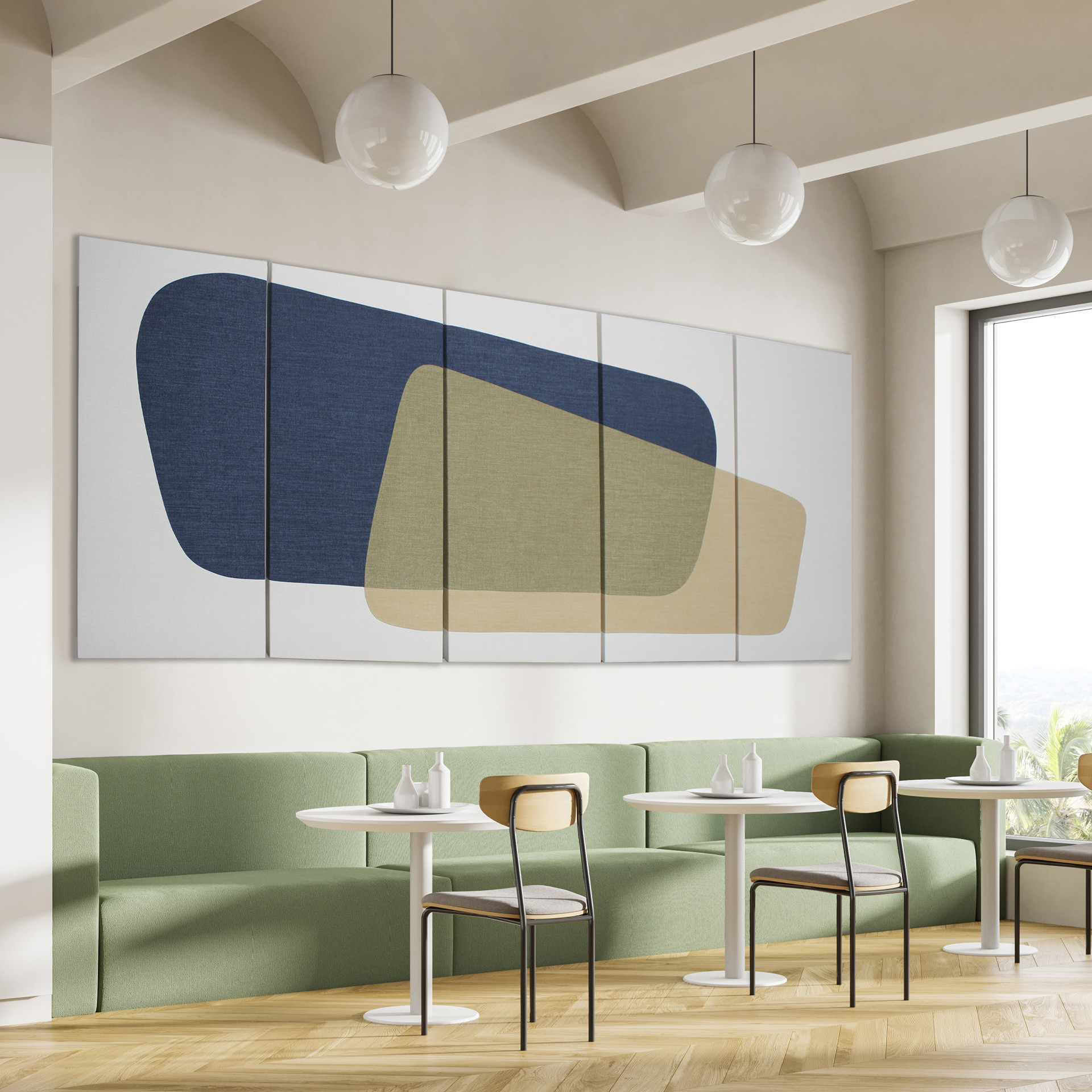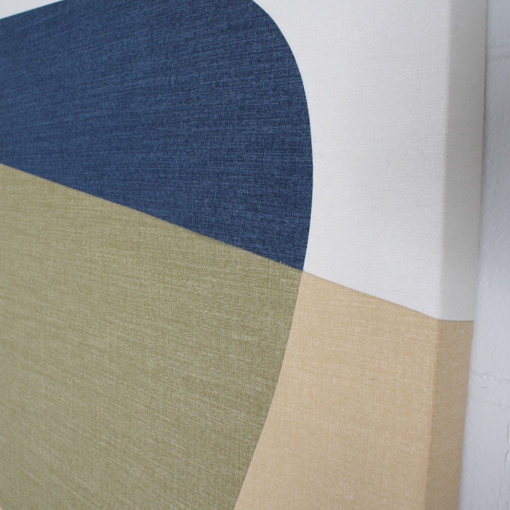 Chaque tableau est fabriqué sur demande en atelier à Québec et signé par l'artiste. Le tissu utilisé pour ce tableau est le SIMON, texture douce et chinée. La murale est composée de 5 tableaux de format 24 x 36 po, pour un total d'environ 124 x 36 po, car vous laisserez un espace minimum de 1 po entre chaque tableau.