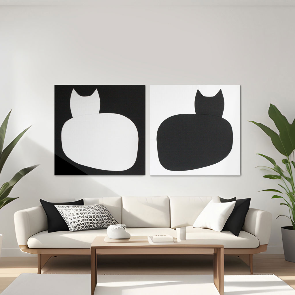 La murale INDÉPENDANCE est une composition en noir et blanc de 2 tableaux représentant un chat. Le dessin est composé de formes en tissu taillées, cousues et assemblées à la main. Chaque tableau est fabriqué sur demande en atelier à Québec et signé par l'artiste.
