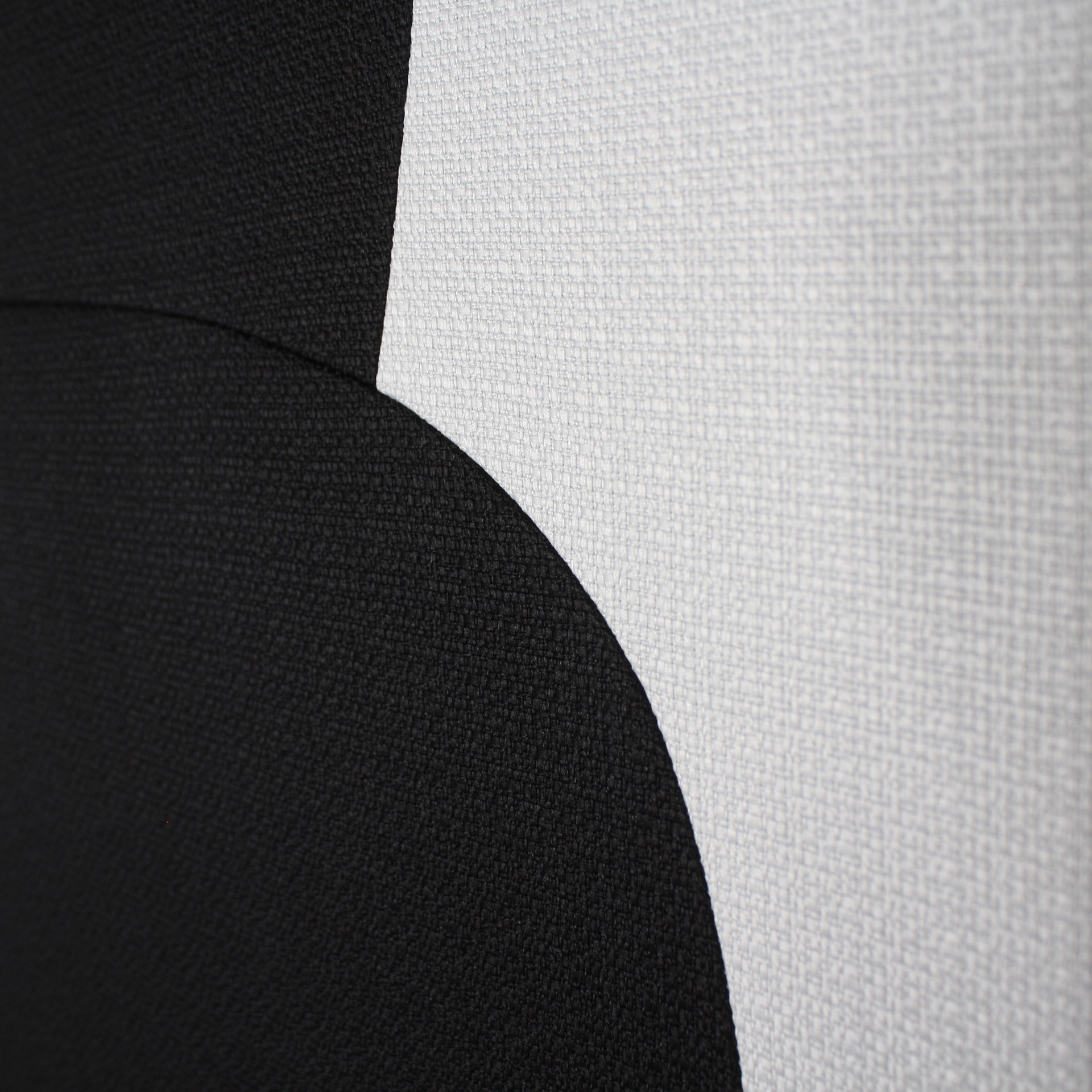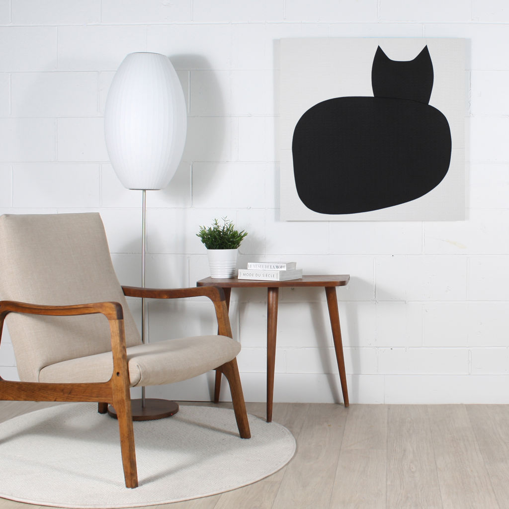 Le tableau INDÉPENDANCE 2 est une composition minimaliste représentant un chat noir sur fond blanc. Le dessin est composé de formes en tissu taillées, cousues et assemblées à la main.