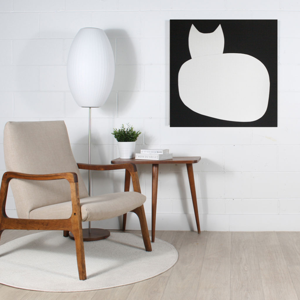 Le tableau INDÉPENDANCE 1 est une composition minimaliste représentant un chat blanc sur fond noir. Le dessin est composé de formes en tissu taillées, cousues et assemblées à la main.