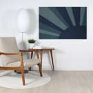 Le tableau WAKE UP est une composition qui rappelle le levé du soleil. Harmonie de bleus. Le dessin est composé de formes en tissu taillées, cousues et assemblées à la main.