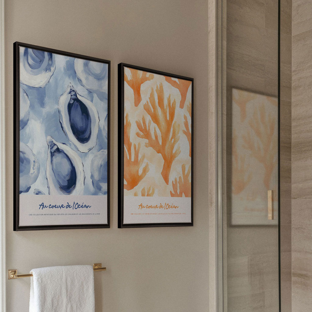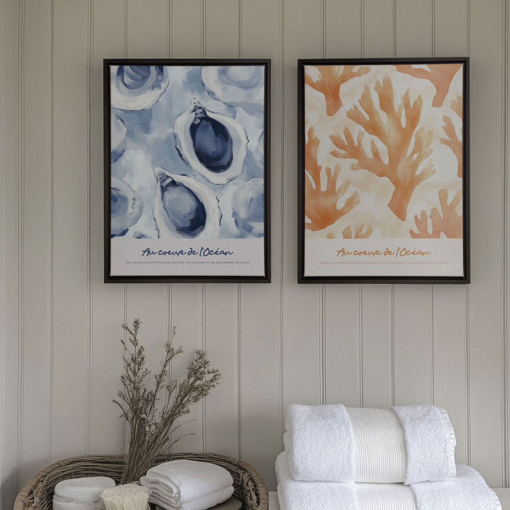 Apportez la sérénité et la beauté des fonds marins dans votre salle de bain avec notre duo d'impressions sur toile "Au Cœur de l'Océan".