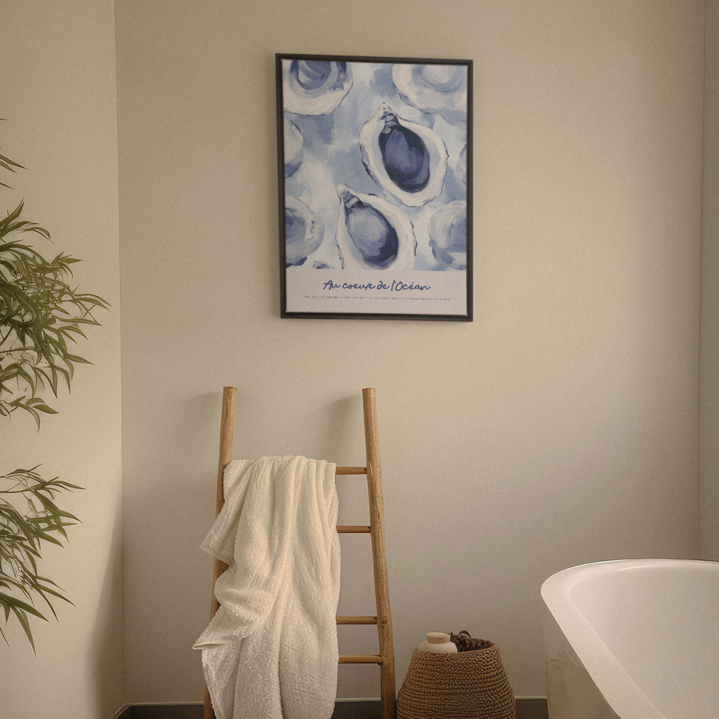 Apportez la sérénité et la beauté des fonds marins dans votre salle de bain avec la toile "Au Cœur de l'Océan".  Les motifs doux et les couleurs harmonieuses créent une ambiance de tranquillité et d'élégance, parfaite pour rehausser la décoration de votre salle de bain.