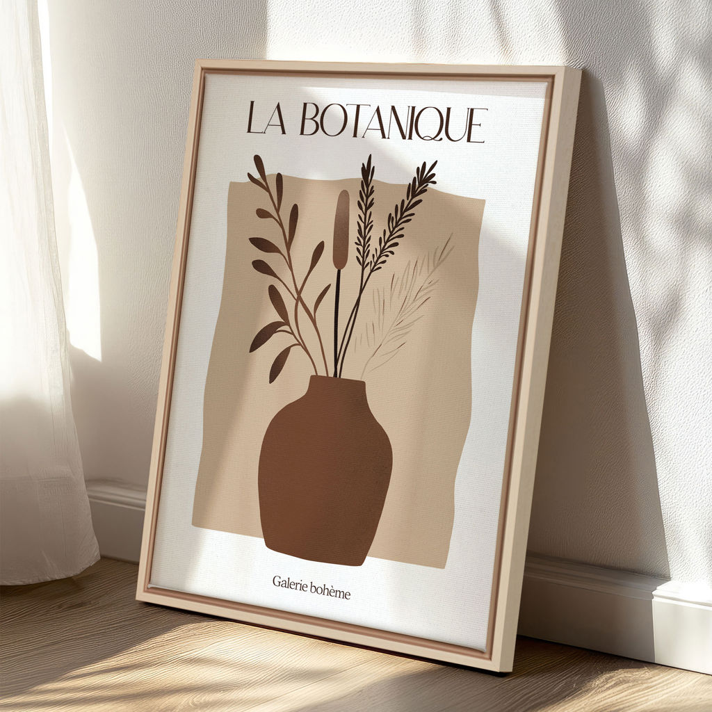 Apportez une touche de nature bohème à votre intérieur avec l’oeuvre Botanique. Cet œuvre d'art présente des arrangements botaniques élégants dans des tons neutres et terreux, encadrés par des vases délicats. L'esthétique minimaliste et naturelle de ces impressions s'intègre parfaitement dans un décor contemporain, bohème ou rustique.