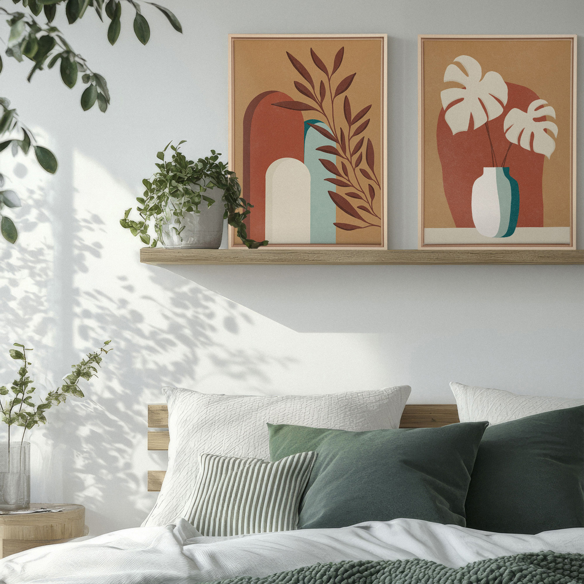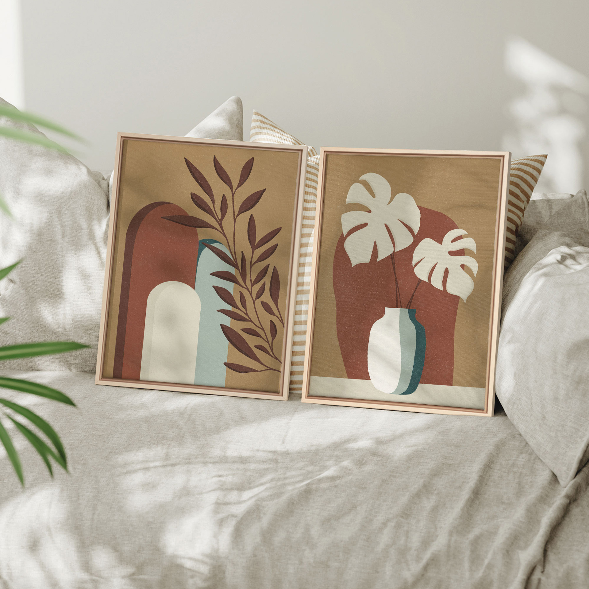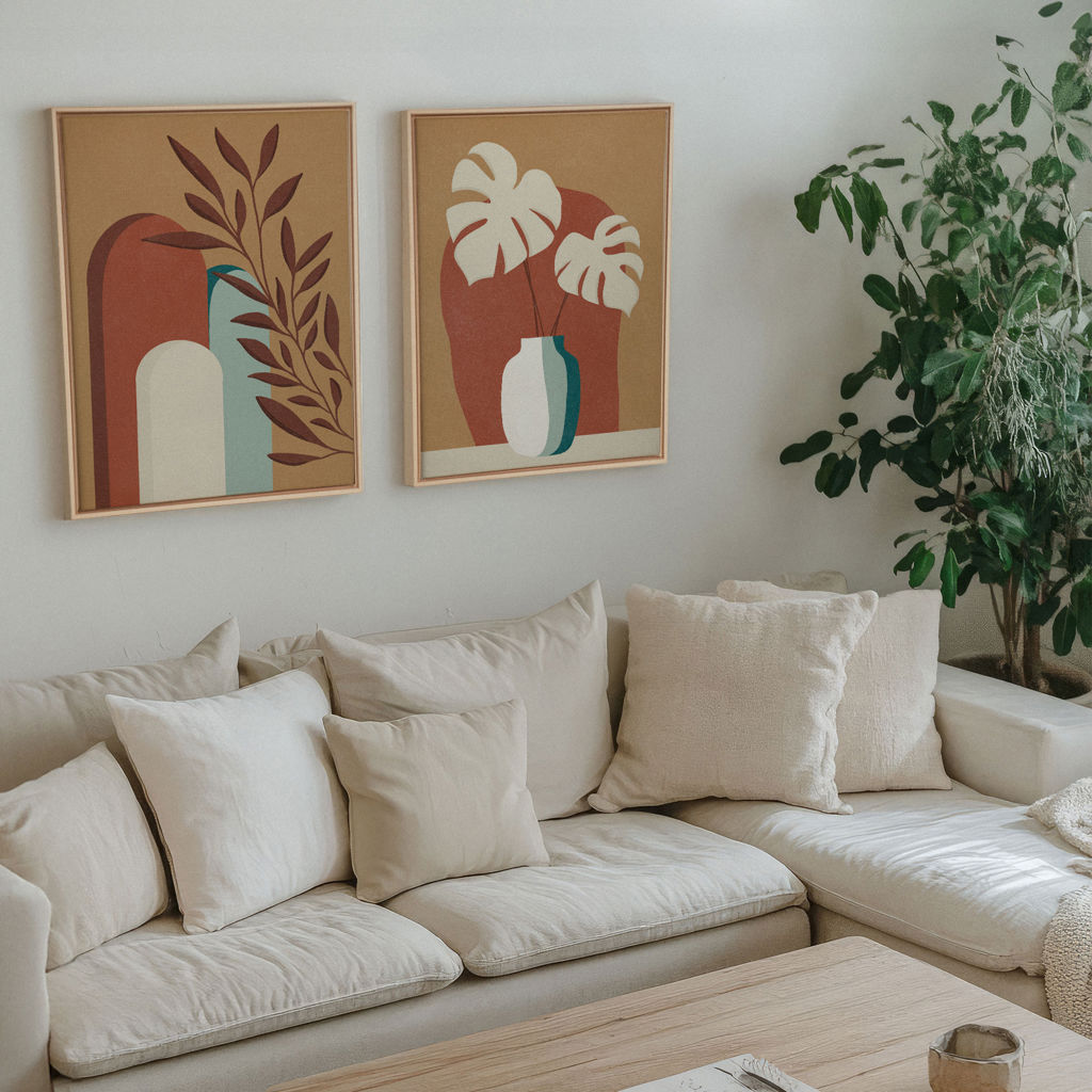Les nuances de terracotta, d'ocre et de vert doux s'harmonisent parfaitement pour créer une ambiance accueillante et apaisante. Idéales pour un salon, une chambre ou un espace de travail, ces impressions apporteront une touche de nature et de chaleur à votre décoration.