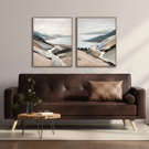Ce tableau offre une scène apaisante où un chemin sinueux mène vers un vaste plan d’eau entouré de reliefs doux et enveloppants. Les tons neutres et terreux créent une atmosphère sereine, parfaite pour ajouter une touche de calme et d’évasion à votre décor.