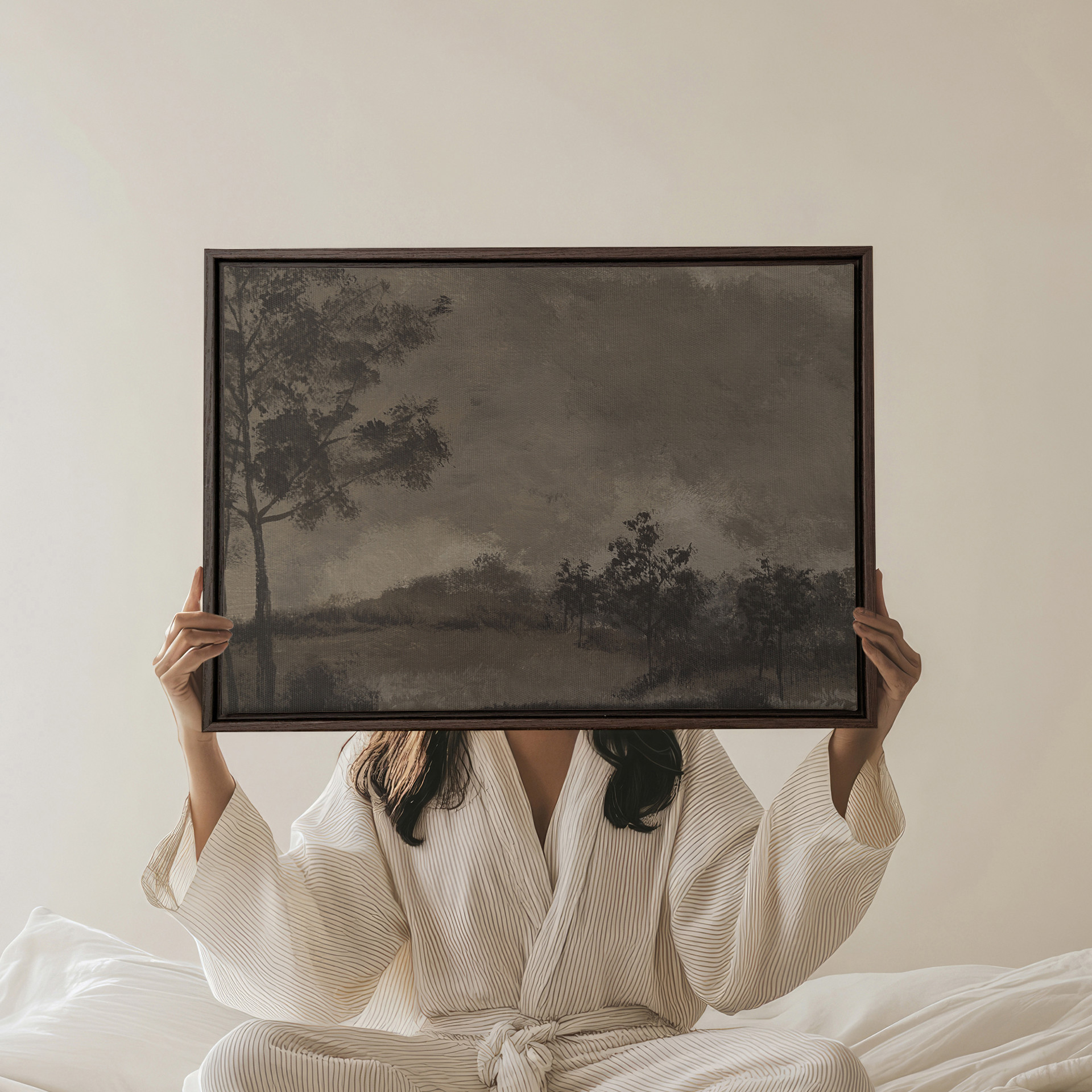 Plongez dans l'atmosphère mystérieuse et captivante de nos toiles imprimées "Hazy Woods". Disponible en deux variantes de couleur, Dark et Neutral, cette oeuvre transporte le spectateur au coeur d'une forêt embrumée, où les arbres se dressent majestueusement sur une colline lointaine.