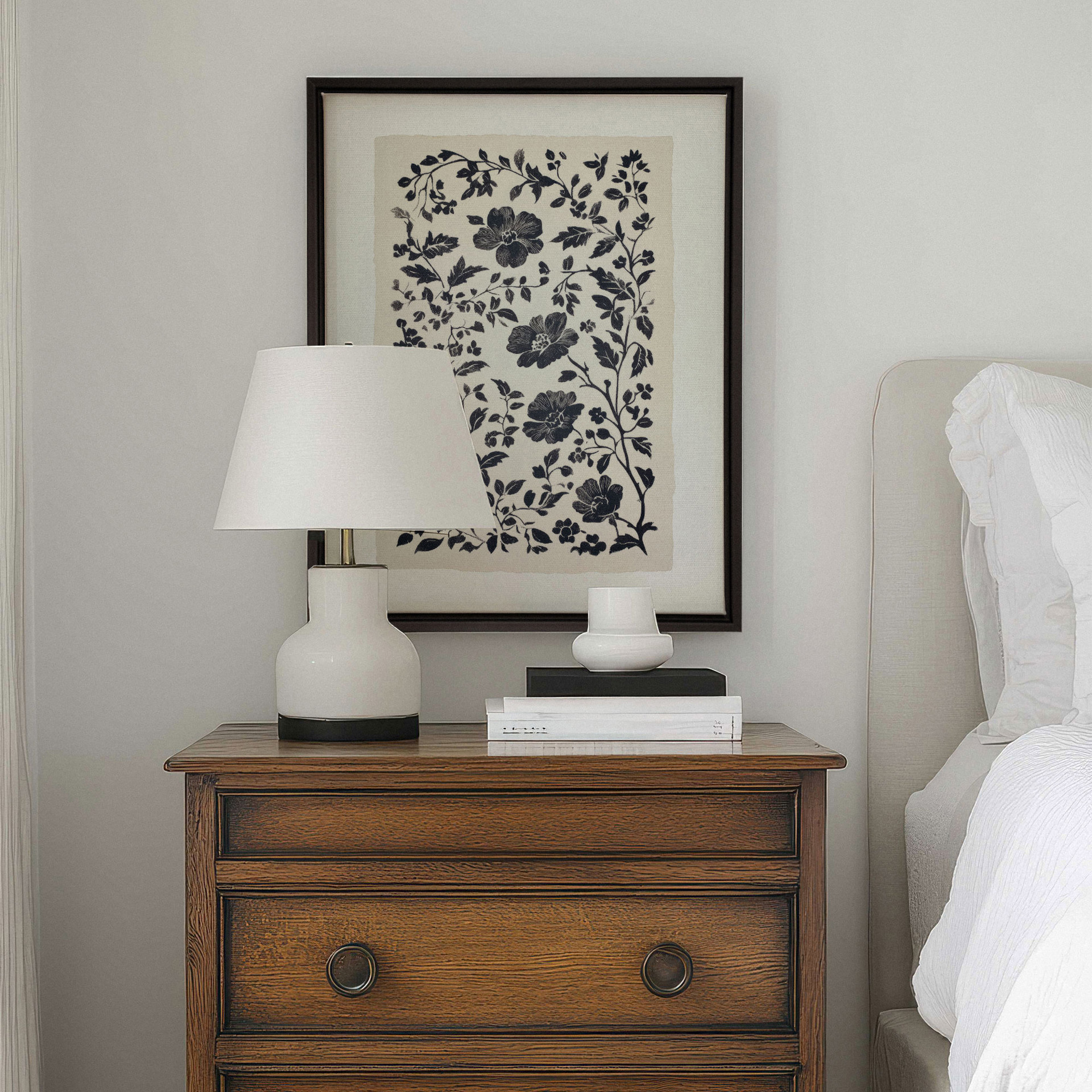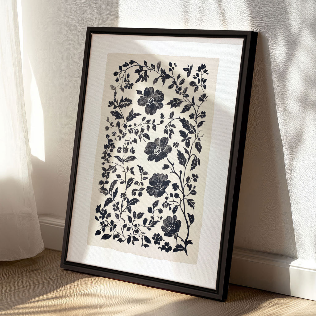 "Floral Shadow" combine élégance et mystère avec un motif floral en noir et blanc qui évoque l'art traditionnel du papier découpé. Les contours nets et contrastés de ce design apportent une sophistication intemporelle, parfaite pour les décors classiques ou contemporains.