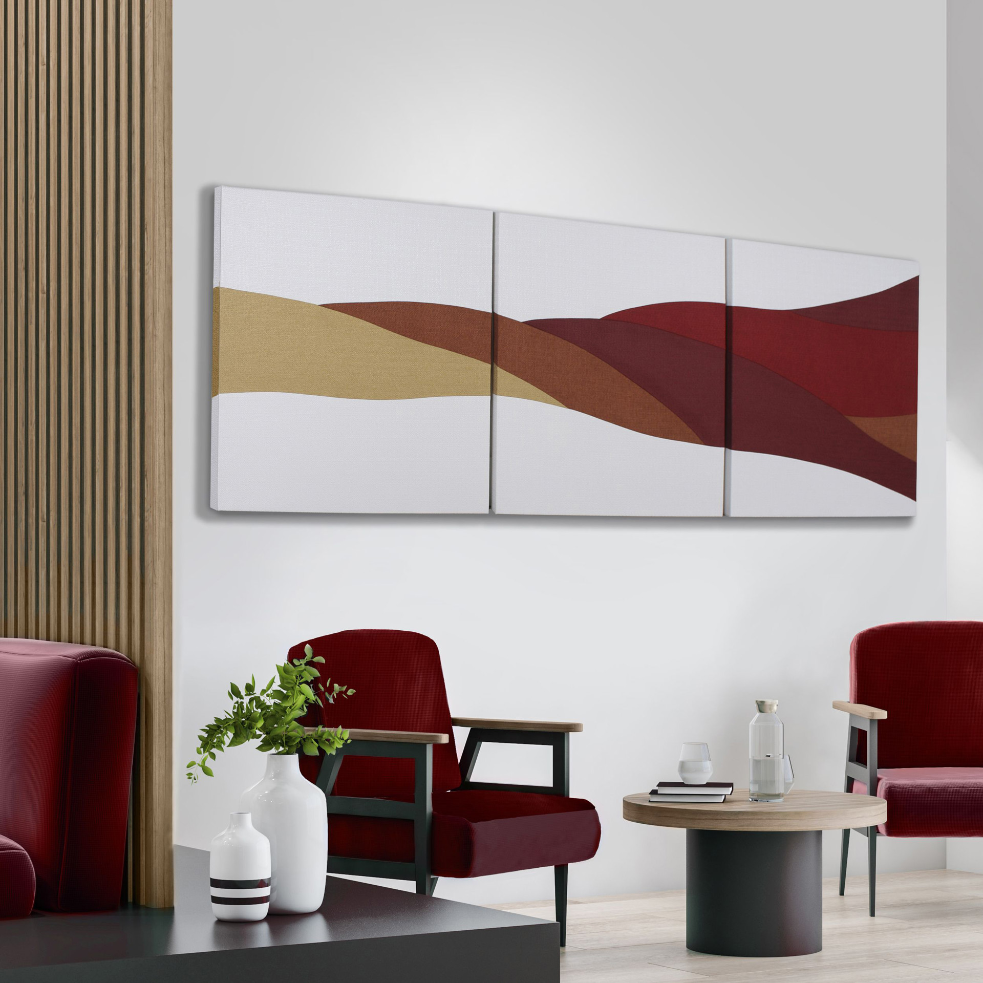 Ces tableaux en tissu, en plus d'offrir une ambiance des plus chaleureuse offrent des propriétés acoustiques qui aideront à réduire les nuisances sonores dans votre environnement.