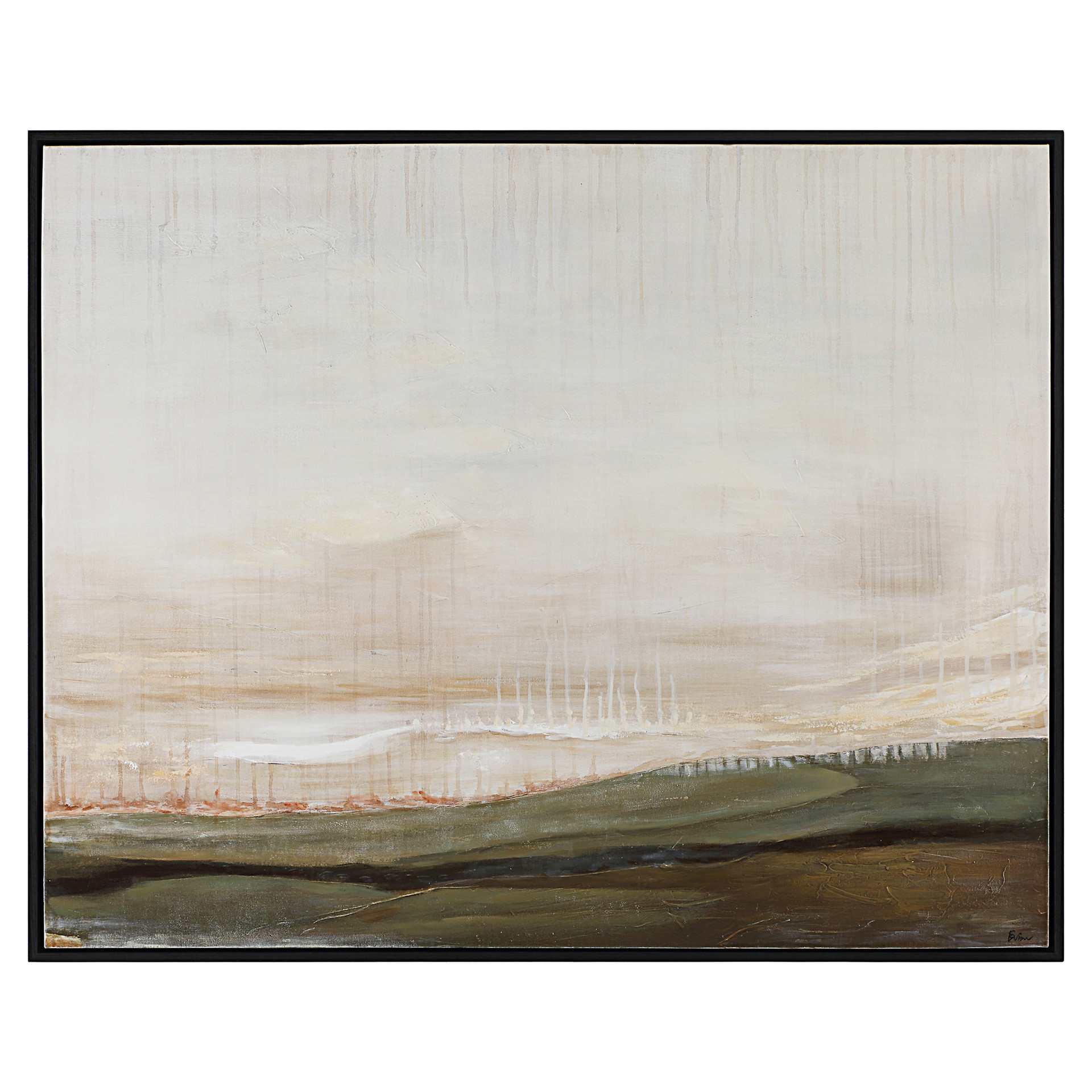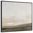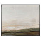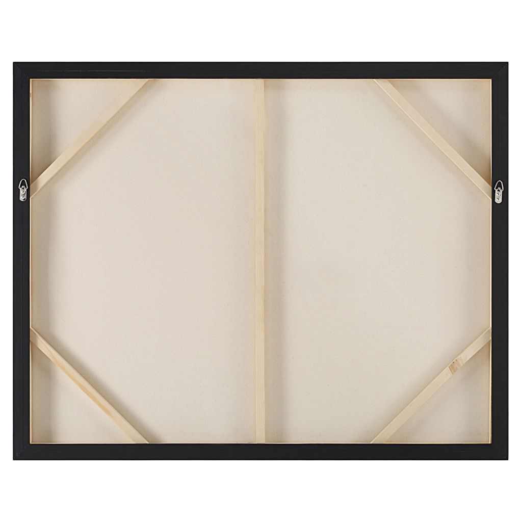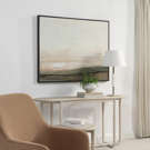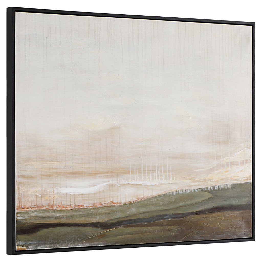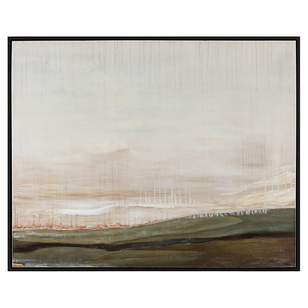 Encadrée en noir mat, cette toile peinte à la main unit la terre et le ciel pour apporter un caractère dramatique et visuel à la pièce.