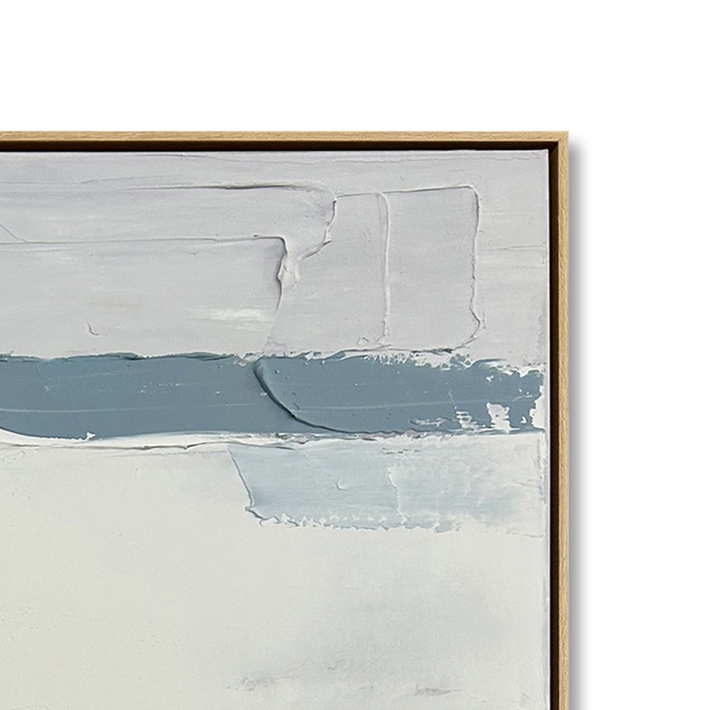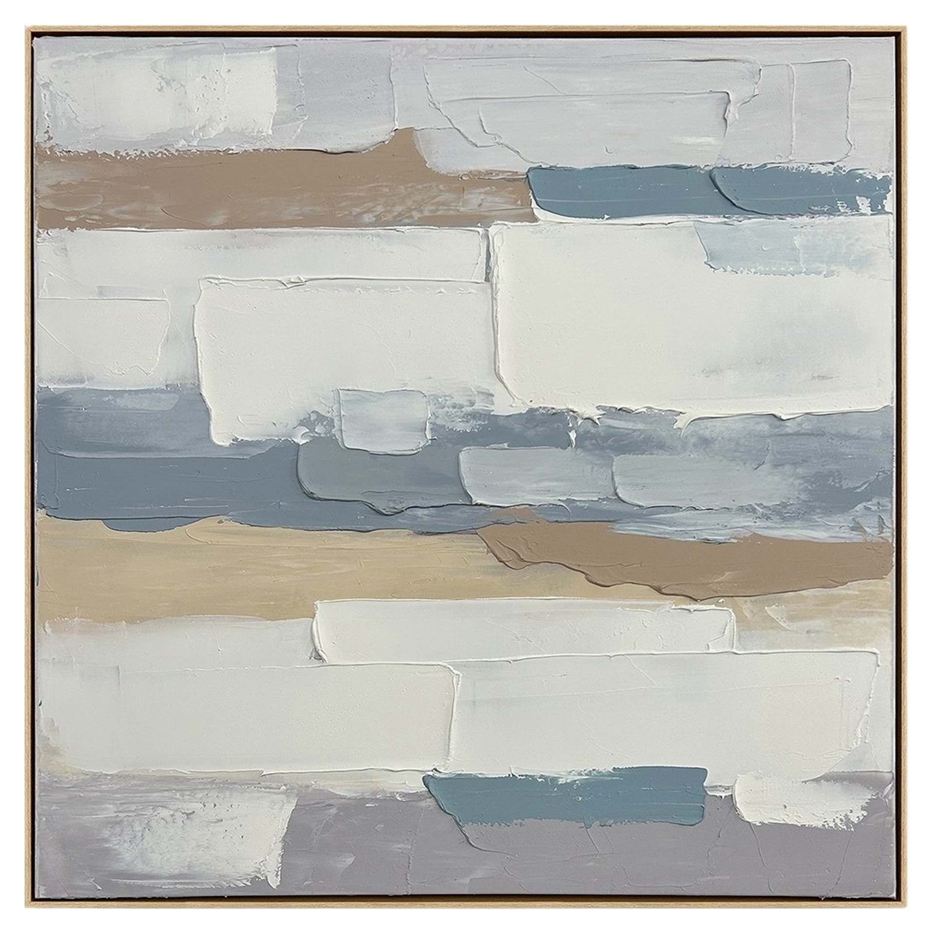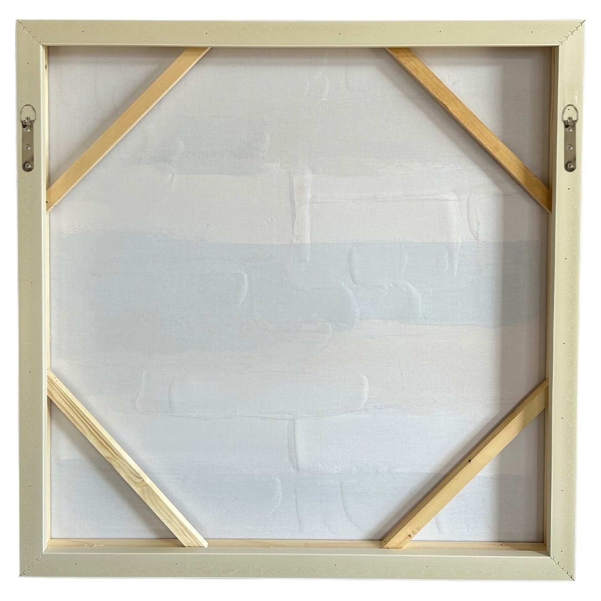 La peinture abstraite Resonare avec de larges touches de blanc, bleu et beige, toutes ajustées dans un cadre de 40x40 po, rehaussera votre espace avec des uvres d´art murales 100% peintes à la main, alliant sophistication moderne et artisanat.