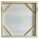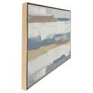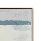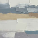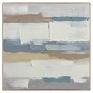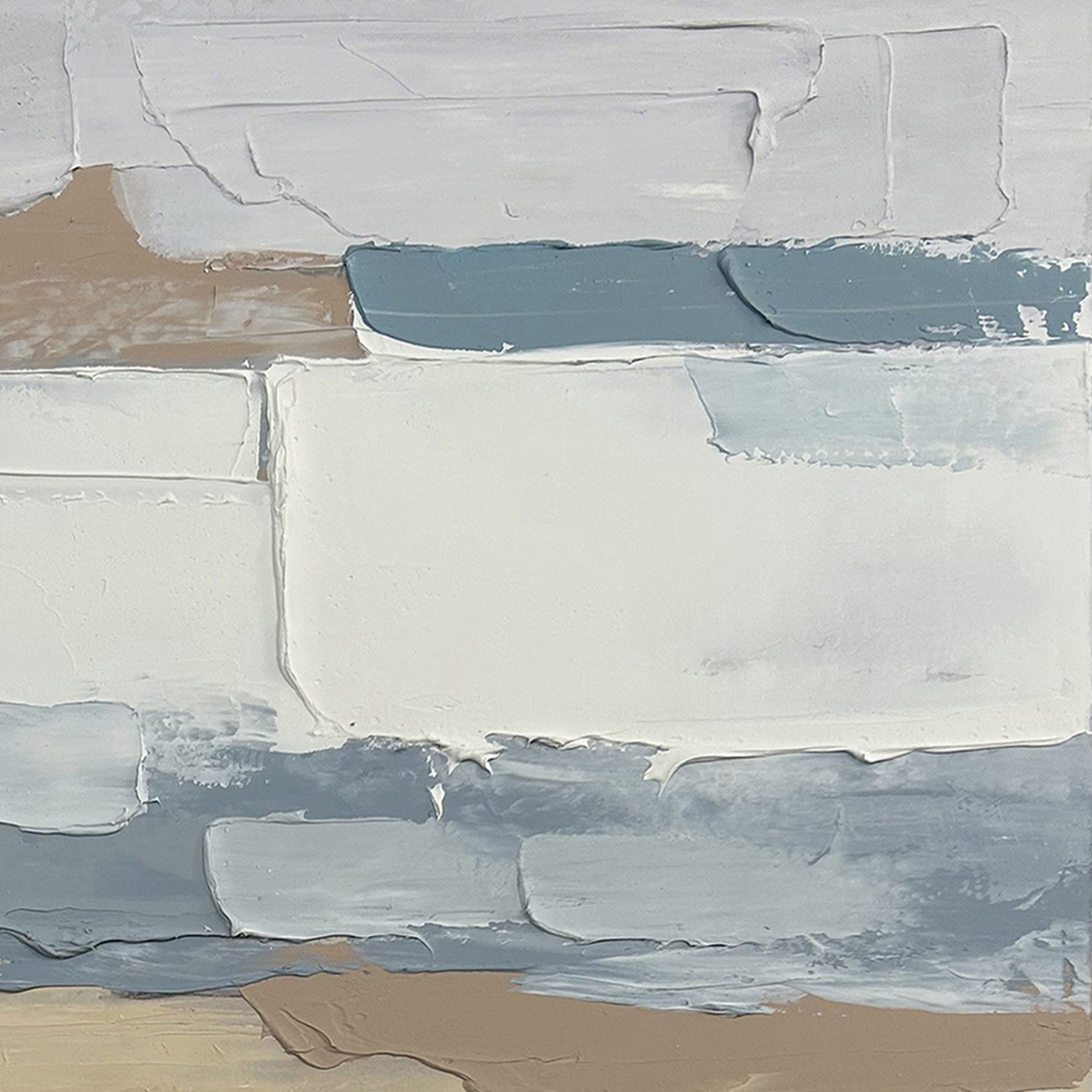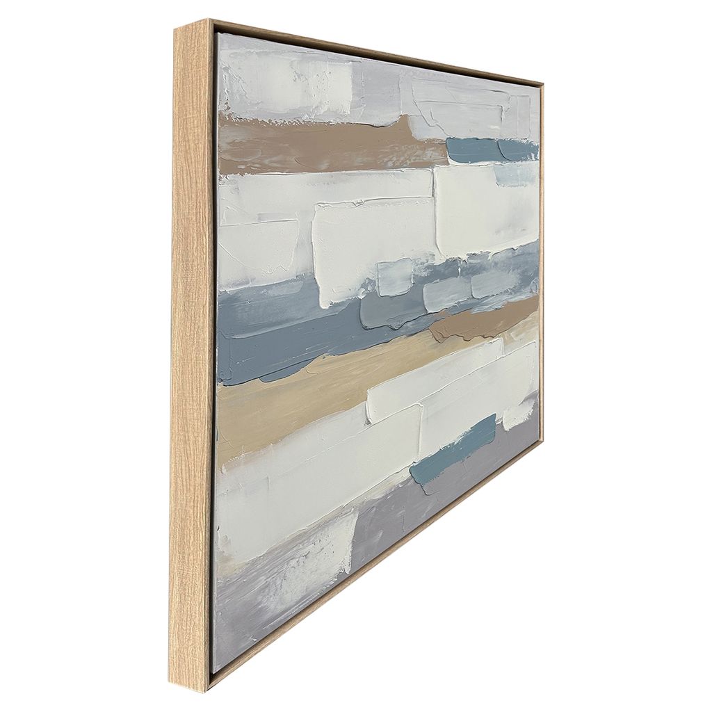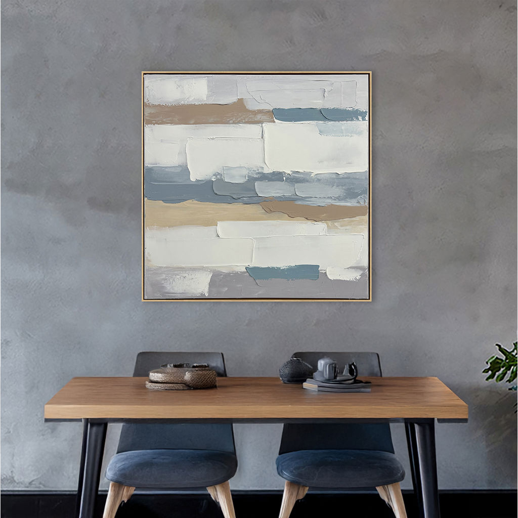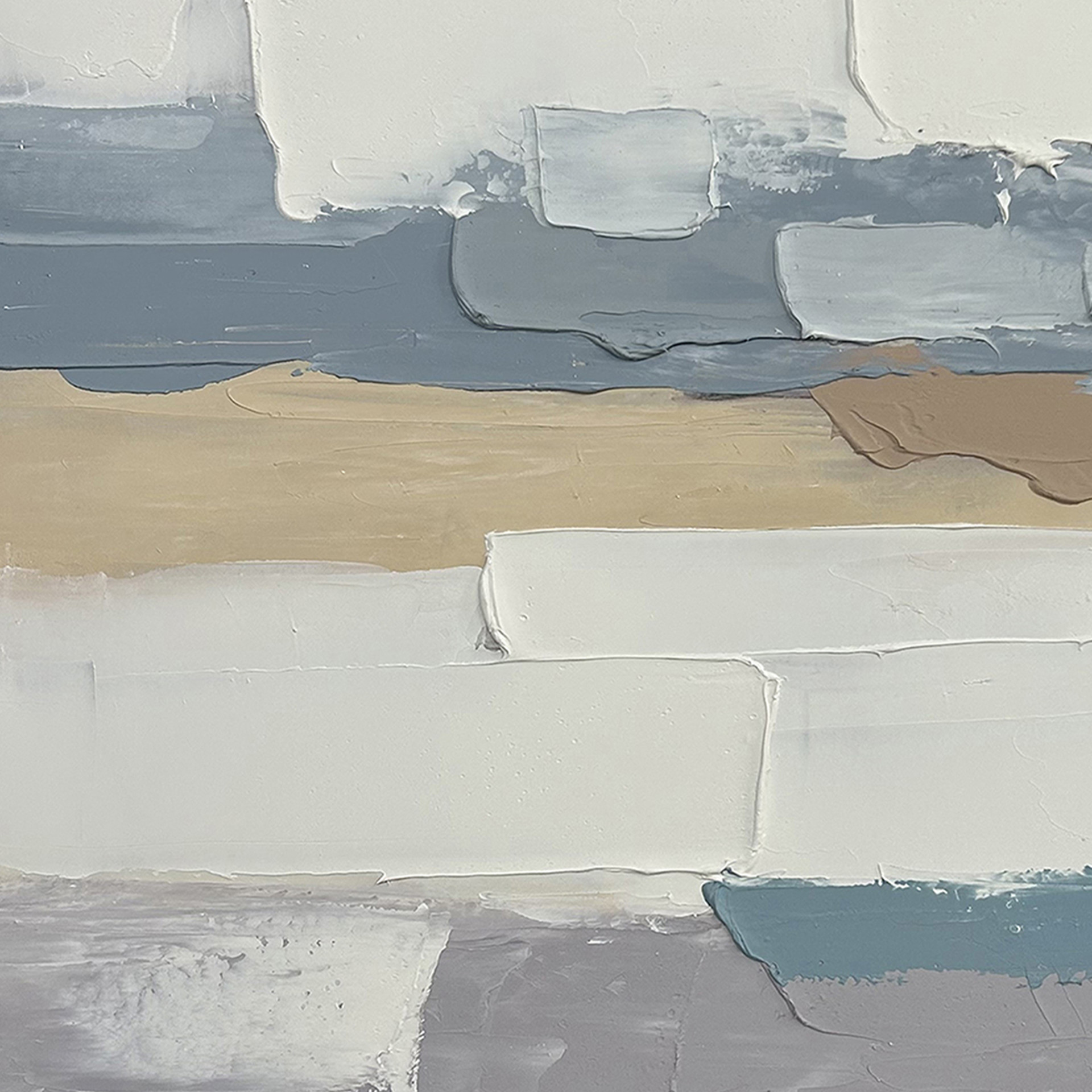 La peinture abstraite Resonare avec de larges touches de blanc, bleu et beige, toutes ajustées dans un cadre de 40x40 po, rehaussera votre espace avec des uvres d´art murales 100% peintes à la main, alliant sophistication moderne et artisanat.