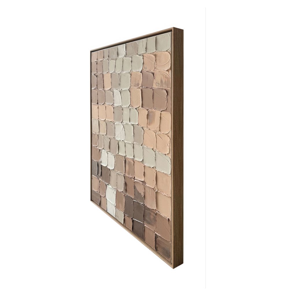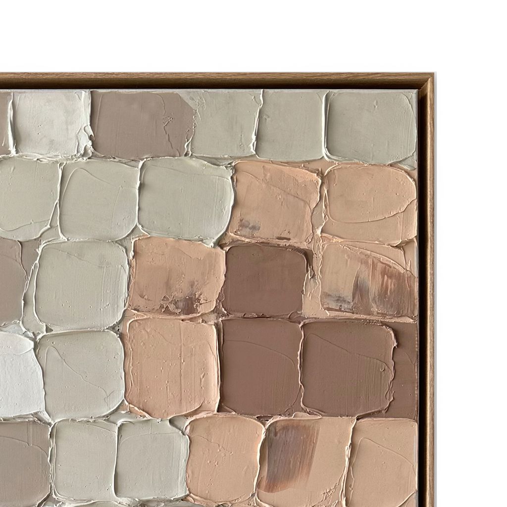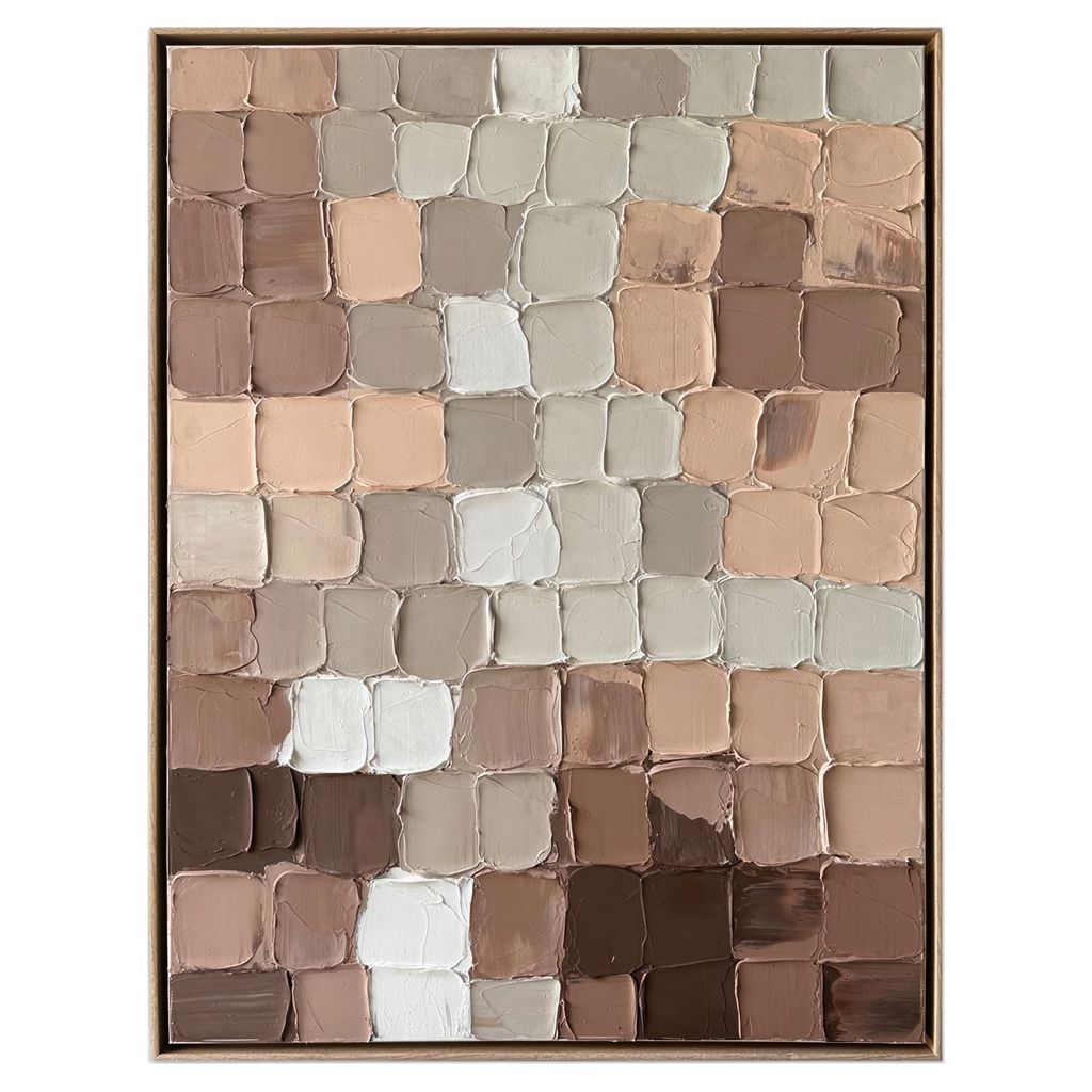La peinture abstraite fragmentée 36 x 48 po d´Essentia avec des blocs de tons de terre rehaussera votre espace avec des oeuvres d´art murales peintes à la main à 100%, alliant sophistication moderne et artisanat.