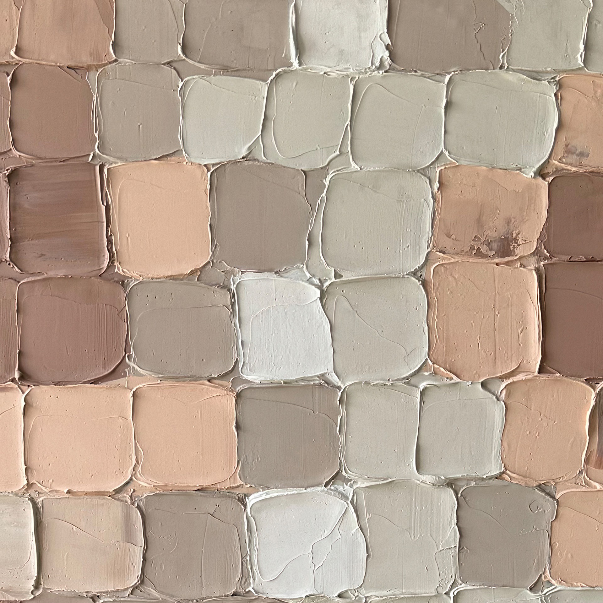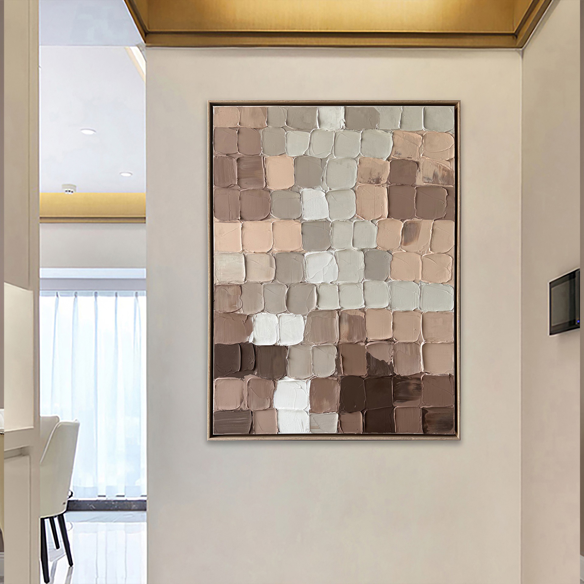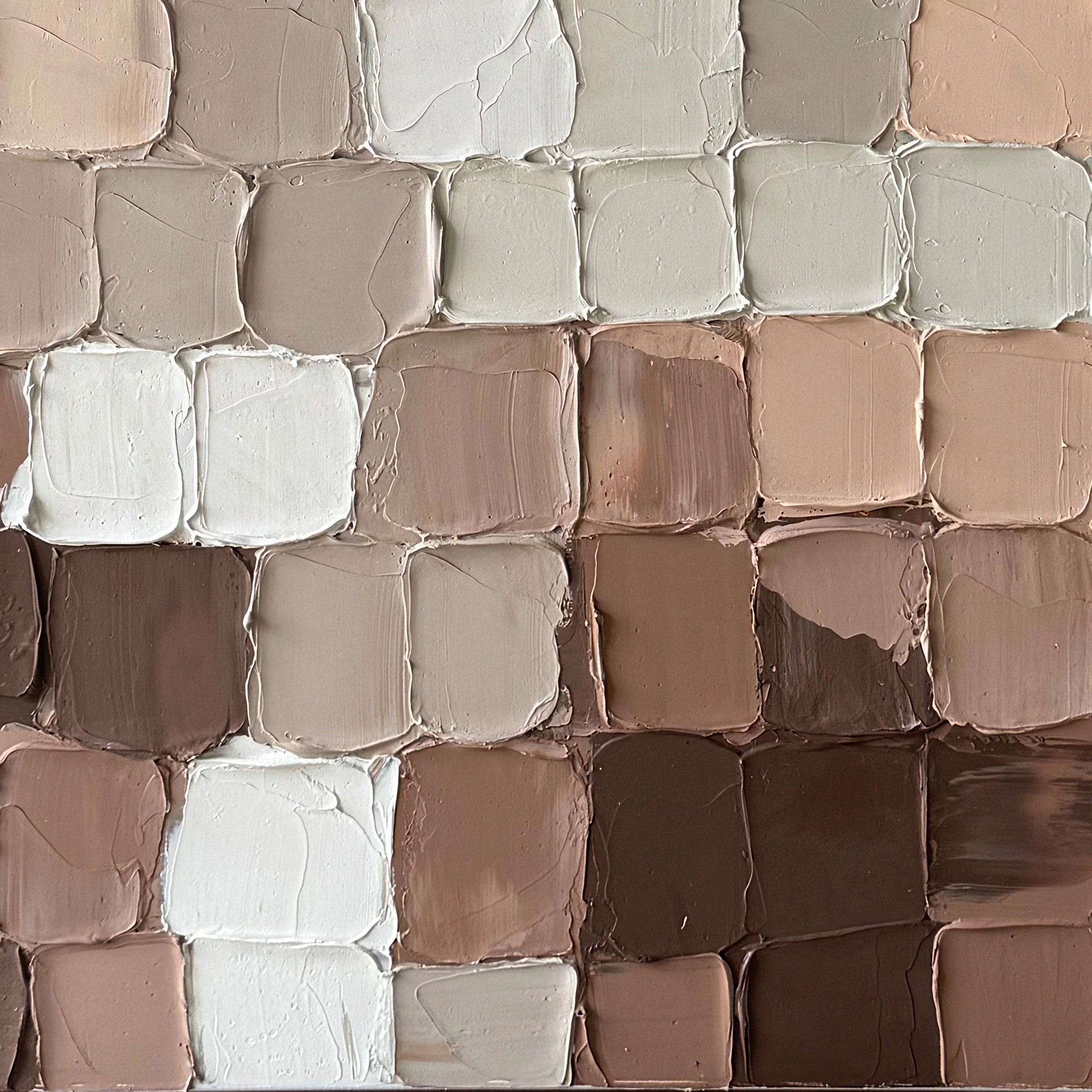 La peinture abstraite fragmentée 36 x 48 po d´Essentia avec des blocs de tons de terre rehaussera votre espace avec des oeuvres d´art murales peintes à la main à 100%, alliant sophistication moderne et artisanat.