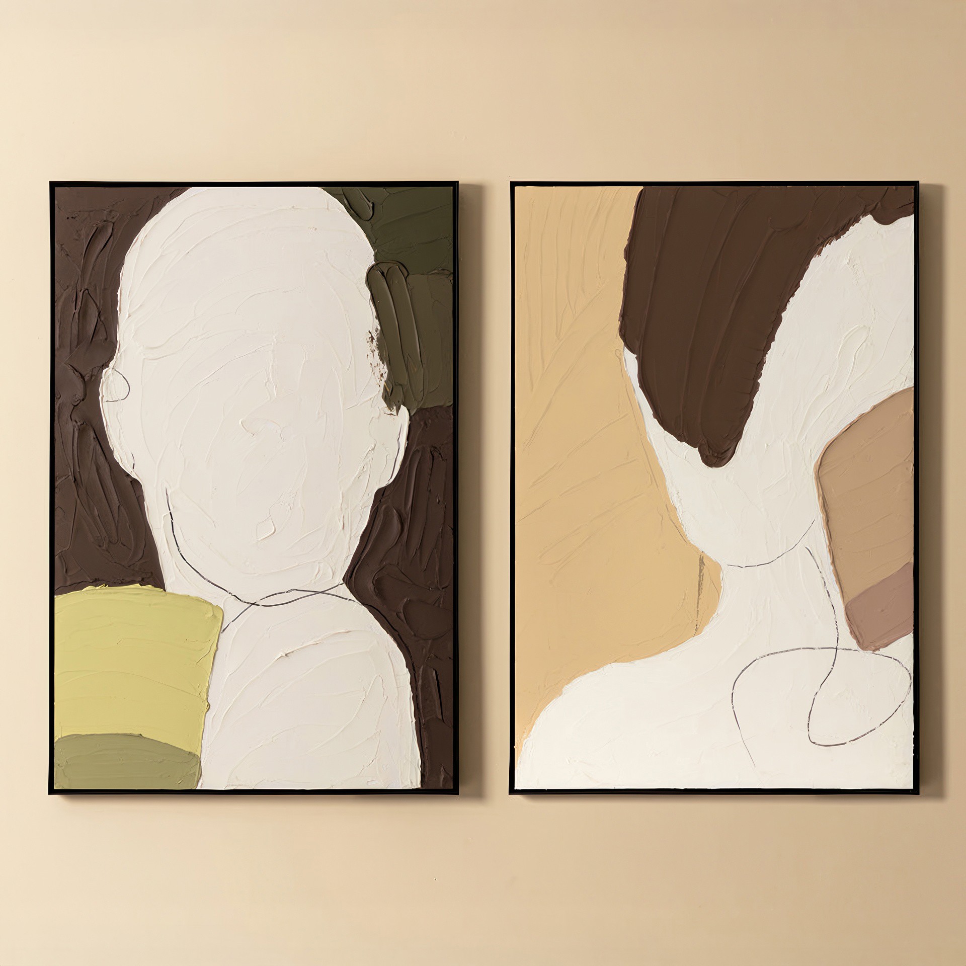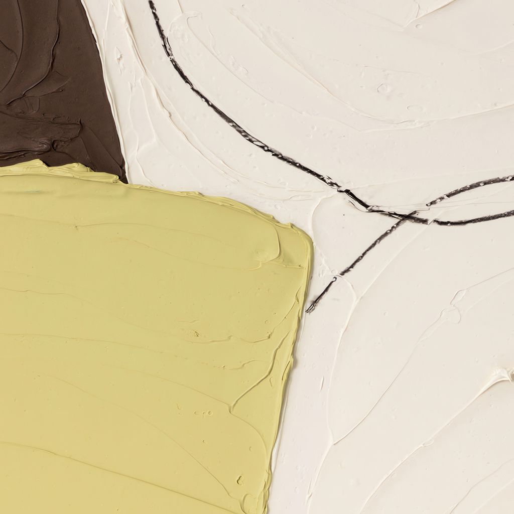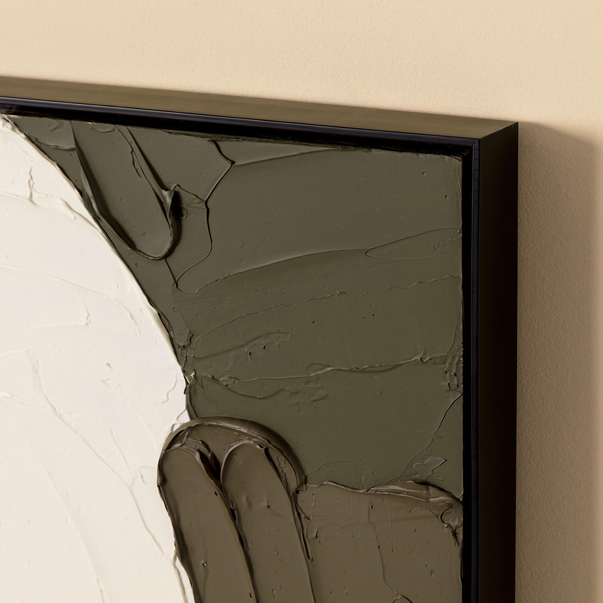 D'épaisses couches de peinture distinctes, aux tons verts et bruns, lui confèrent personnalité et texture vive. À exposer individuellement ou à associer à l'oeuvre assortie. Cadre flottant noir.