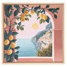 Limonade Rose offre une vue ensoleillée d'un balcon méditerranéen entouré de citronniers. Son ambiance rose pastel et son horizon côtier évoquent les vacances et la dolce vita.