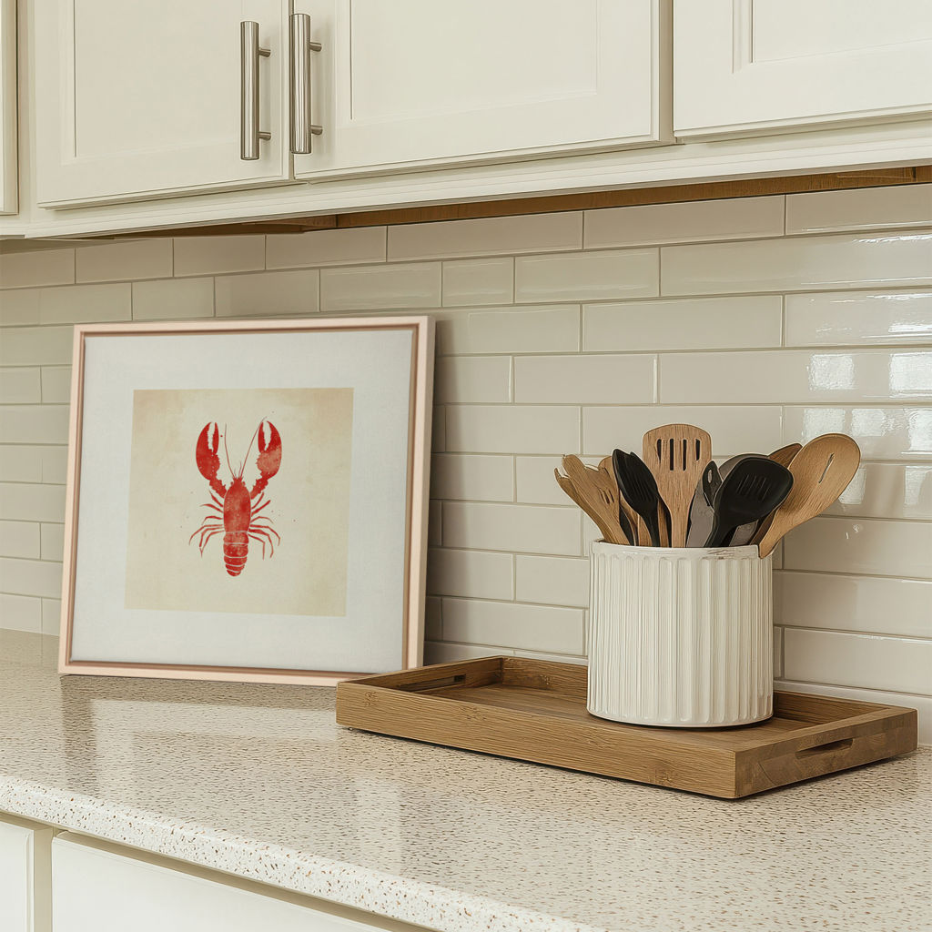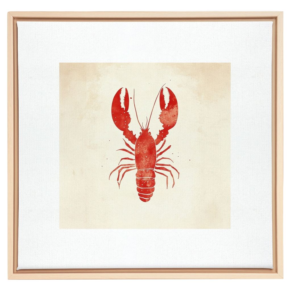 Côte Salée présente un homard rouge vif sur fond crème, dans un style minimaliste et graphique. Cette oeuvre évoque la mer, les vacances gourmandes et le charme des côtes maritimes.