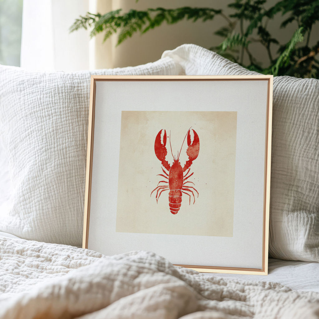 Côte Salée présente un homard rouge vif sur fond crème, dans un style minimaliste et graphique. Cette oeuvre évoque la mer, les vacances gourmandes et le charme des côtes maritimes.