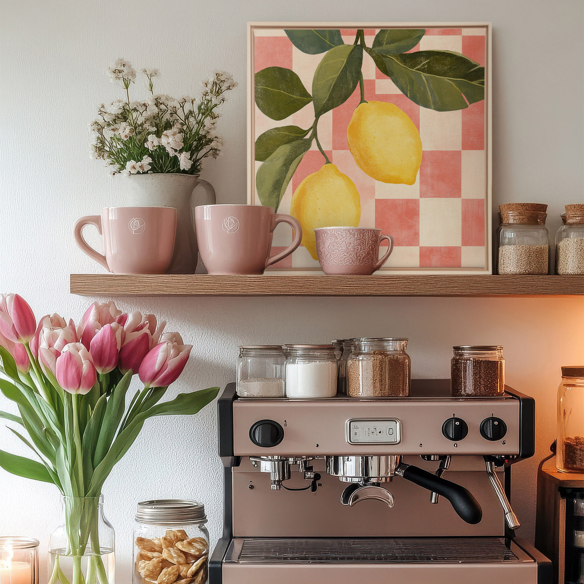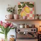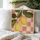 Citronnade Vintage combine un motif de citrons juteux à un fond à carreaux rétro rose et beige. L'oeuvre évoque une ambiance de cuisine estivale et d'apéro sur la terrasse.