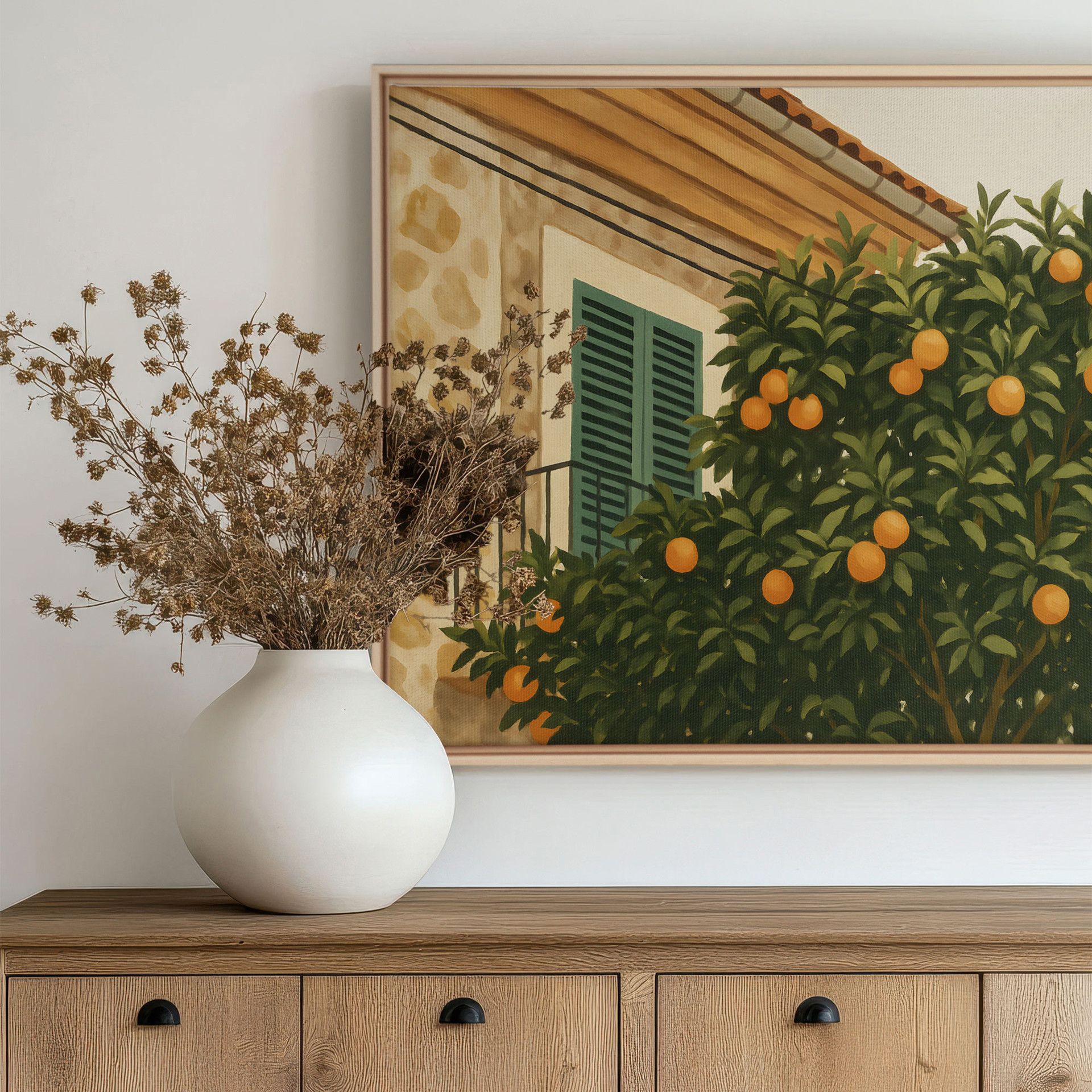 Une oeuvre parfaite pour une cuisine ou un salon ensoleillé. Invitation à la lenteur du Sud.