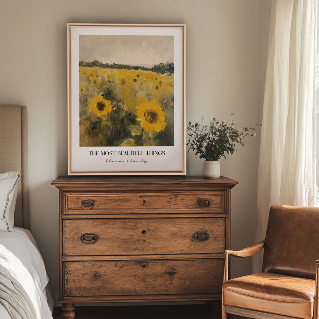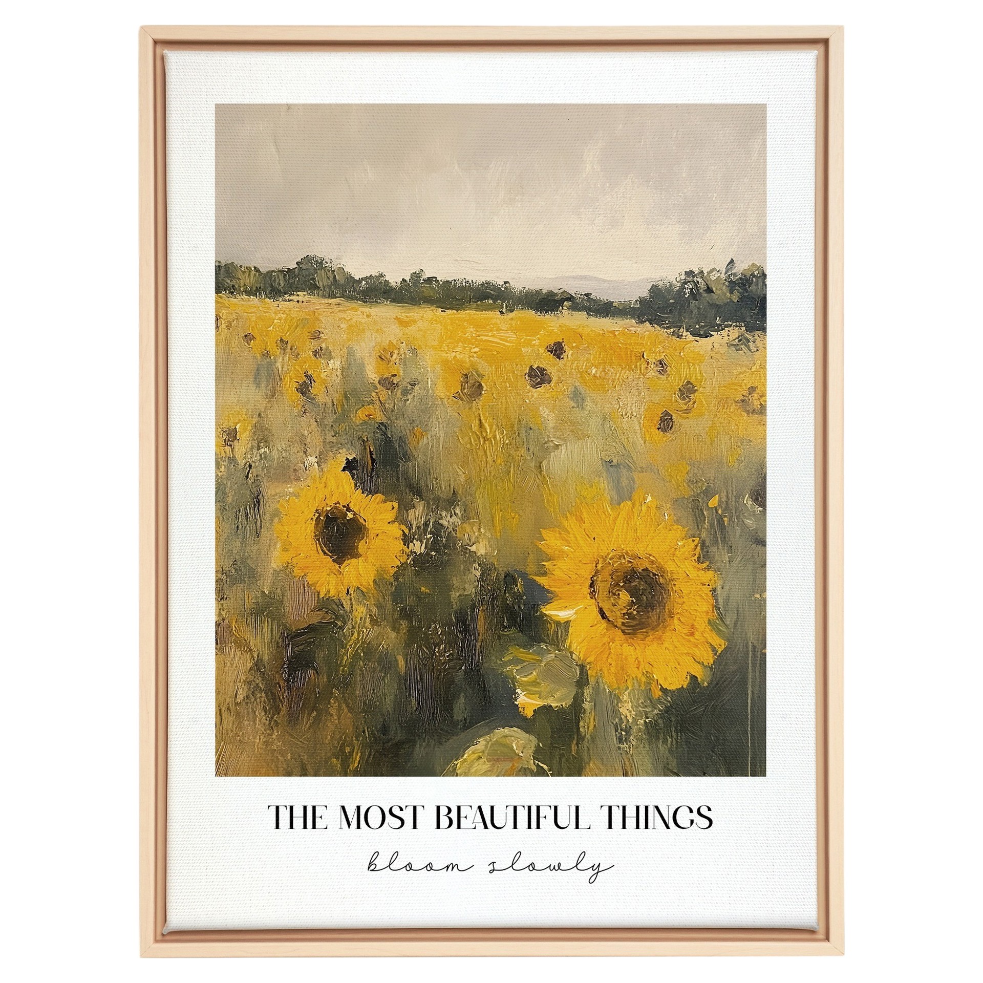 Bloom Slowly capture la beauté tranquille d'un champ de tournesols en pleine floraison.