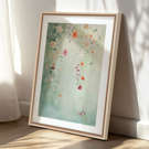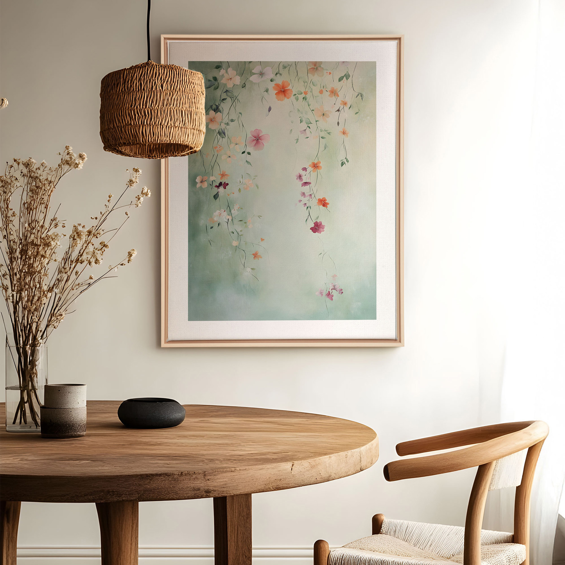 Cette toile imprimée présente une cascade de fleurs suspendues, flottant gracieusement sur un fond vert pâle délicatement nuancé. Les fleurs, dans des tons pastel de rose tendre, de pêche doux et d´orange chaleureux, créent une harmonie parfaite entre couleur et texture.