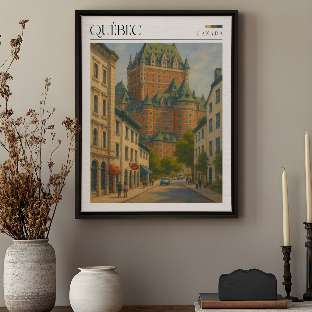 Les teintes chaudes des bâtiments et le vert profond du toit créent une palette harmonieuse et chaleureuse. Québec I célèbre l'histoire, l'architecture et la vie de quartier typique du Vieux-Québec.