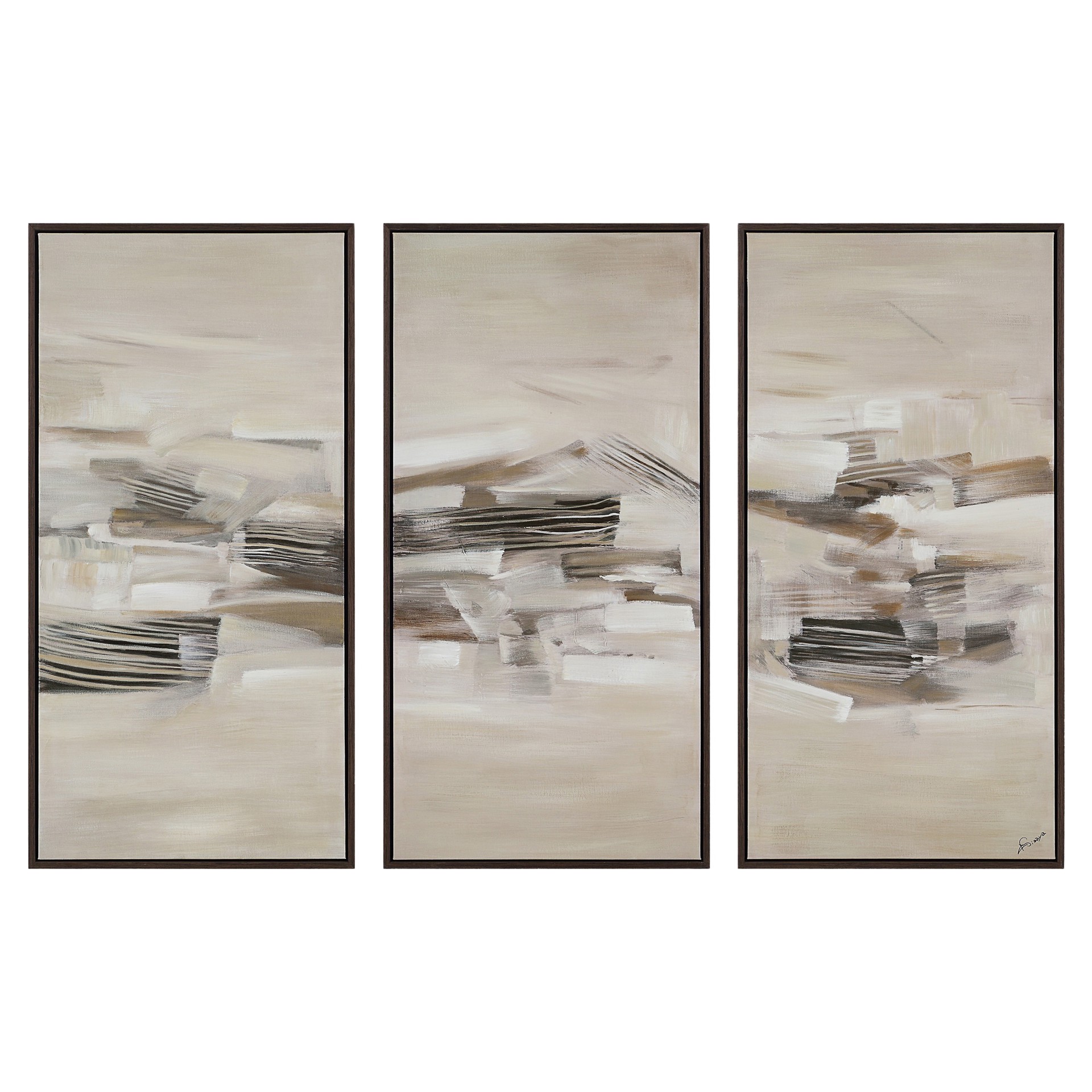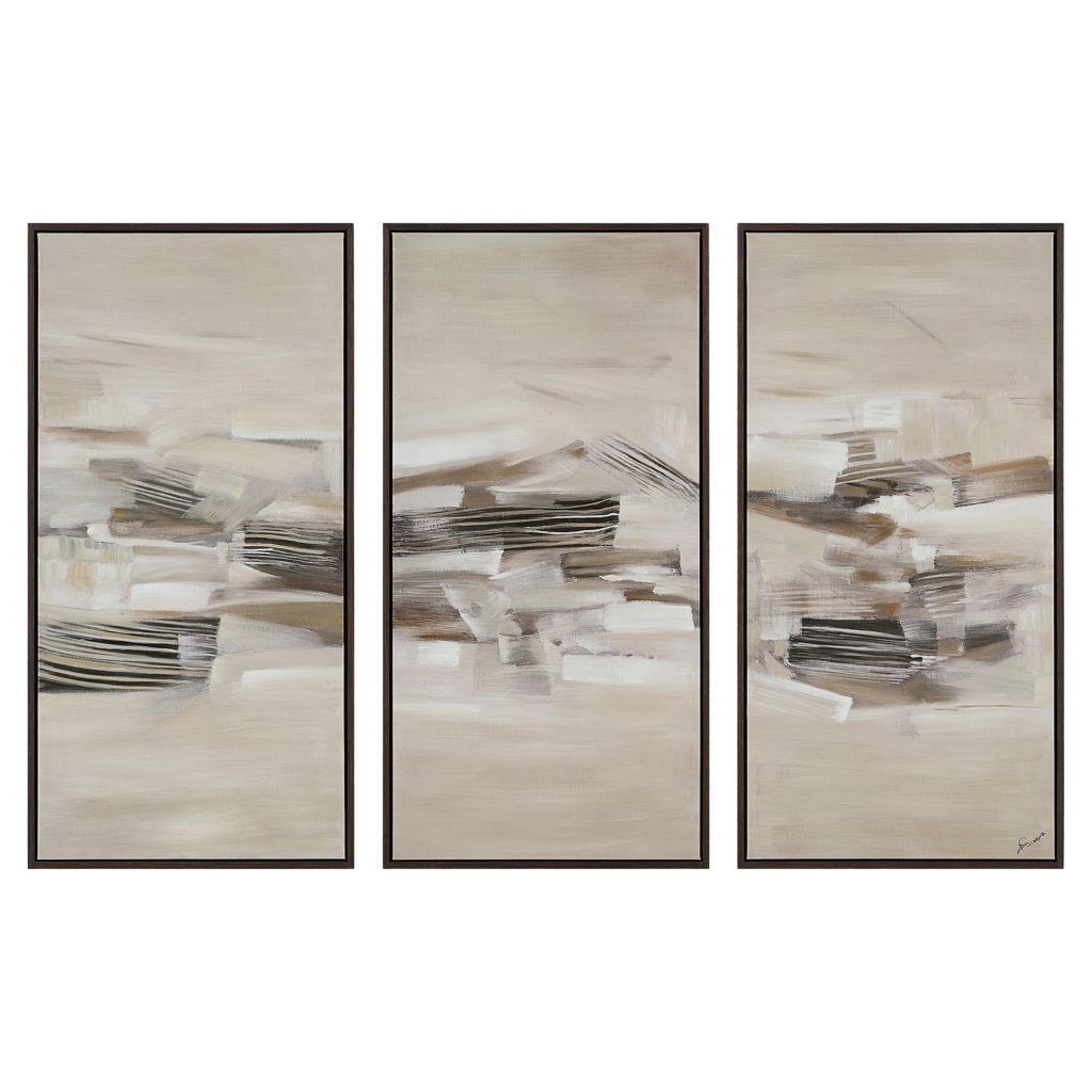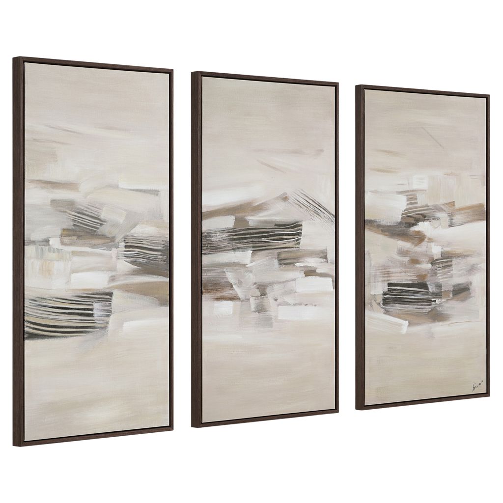 Ce trio peint dans des tons neutres à gros coups de pinceau qui capturent le mouvement et la texture et cadré de chêne noir procure style et beauté rehaussée à tout intérieur moderne, soit en côte à côte ou en superposition.