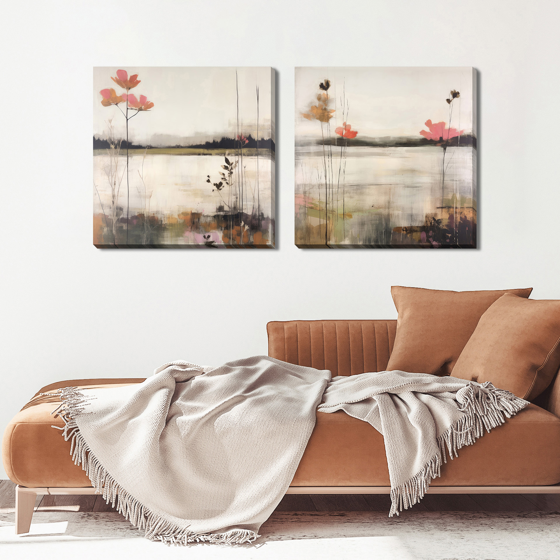 Ses touches abstraites et ses couleurs naturelles évoquent un champ de fleurs paisible, avec de délicats cosmos roses qui se détachent d'un paysage brumeux.
