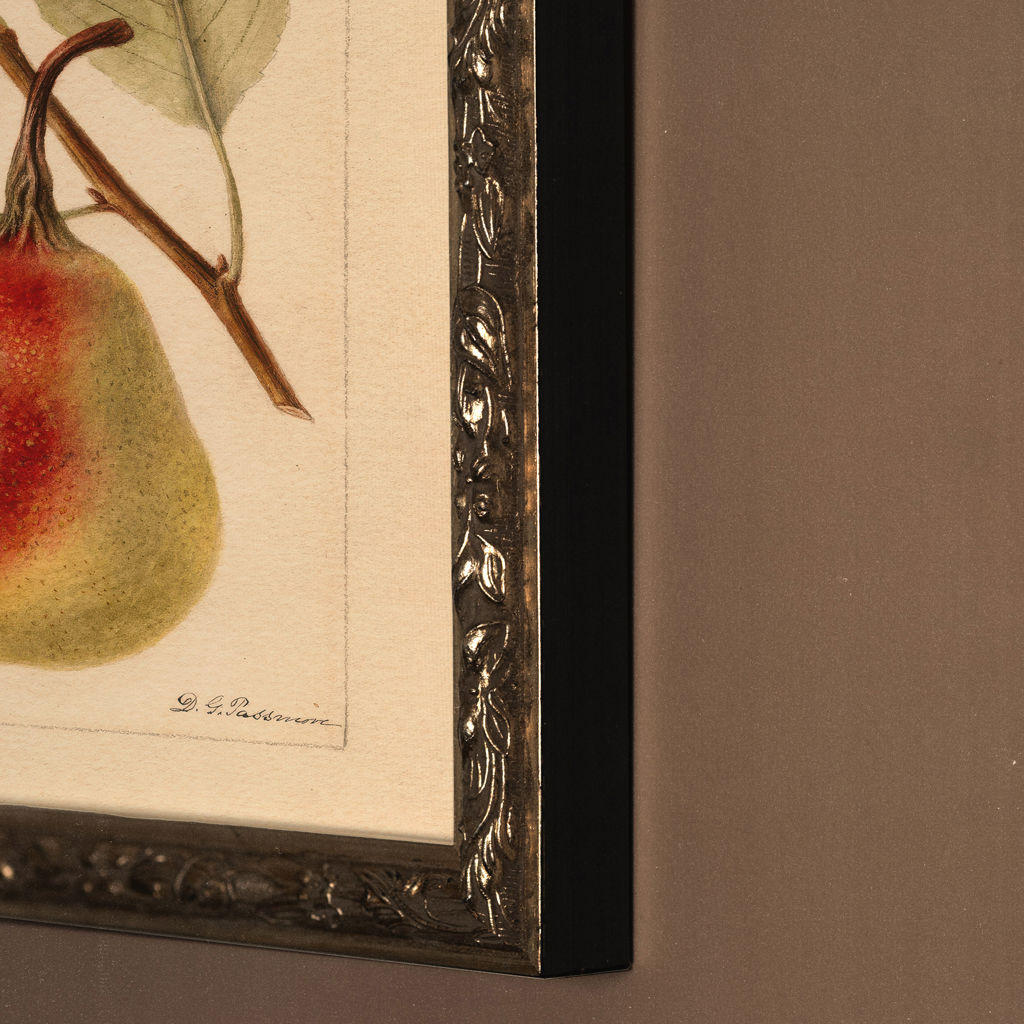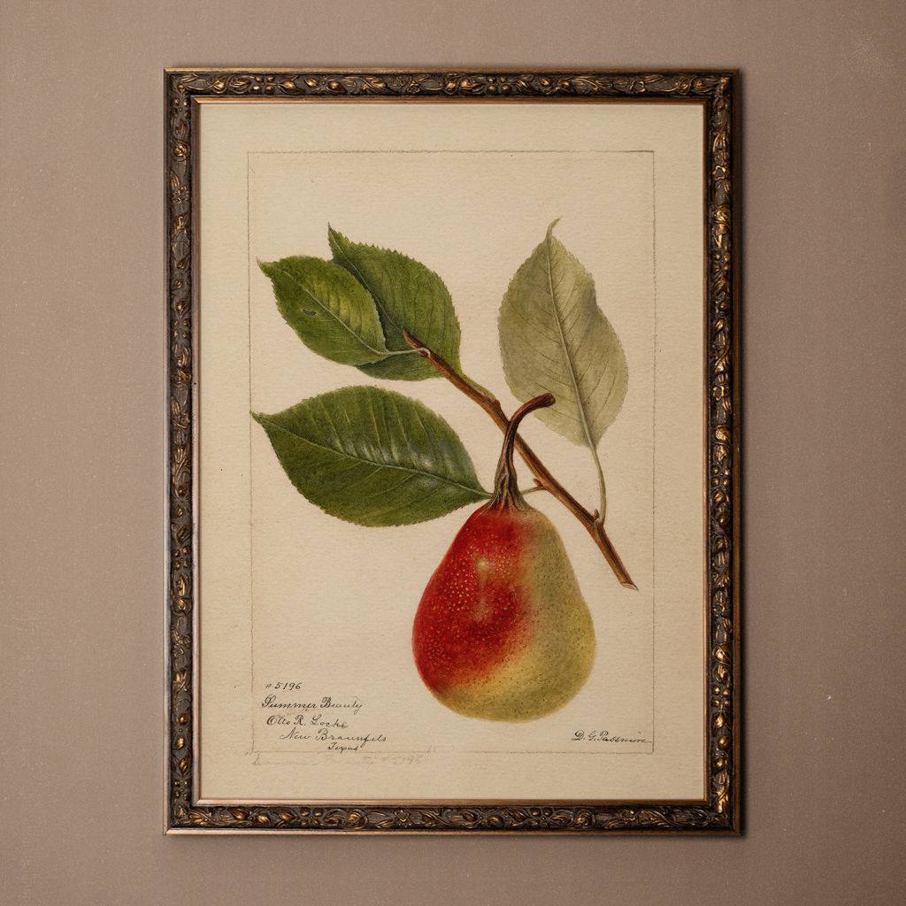 Cette poire délicatement illustrée évoque les récoltes d'été et les douceurs naturelles. Son style raffiné et antique apporte une touche d'élégance au fruit.