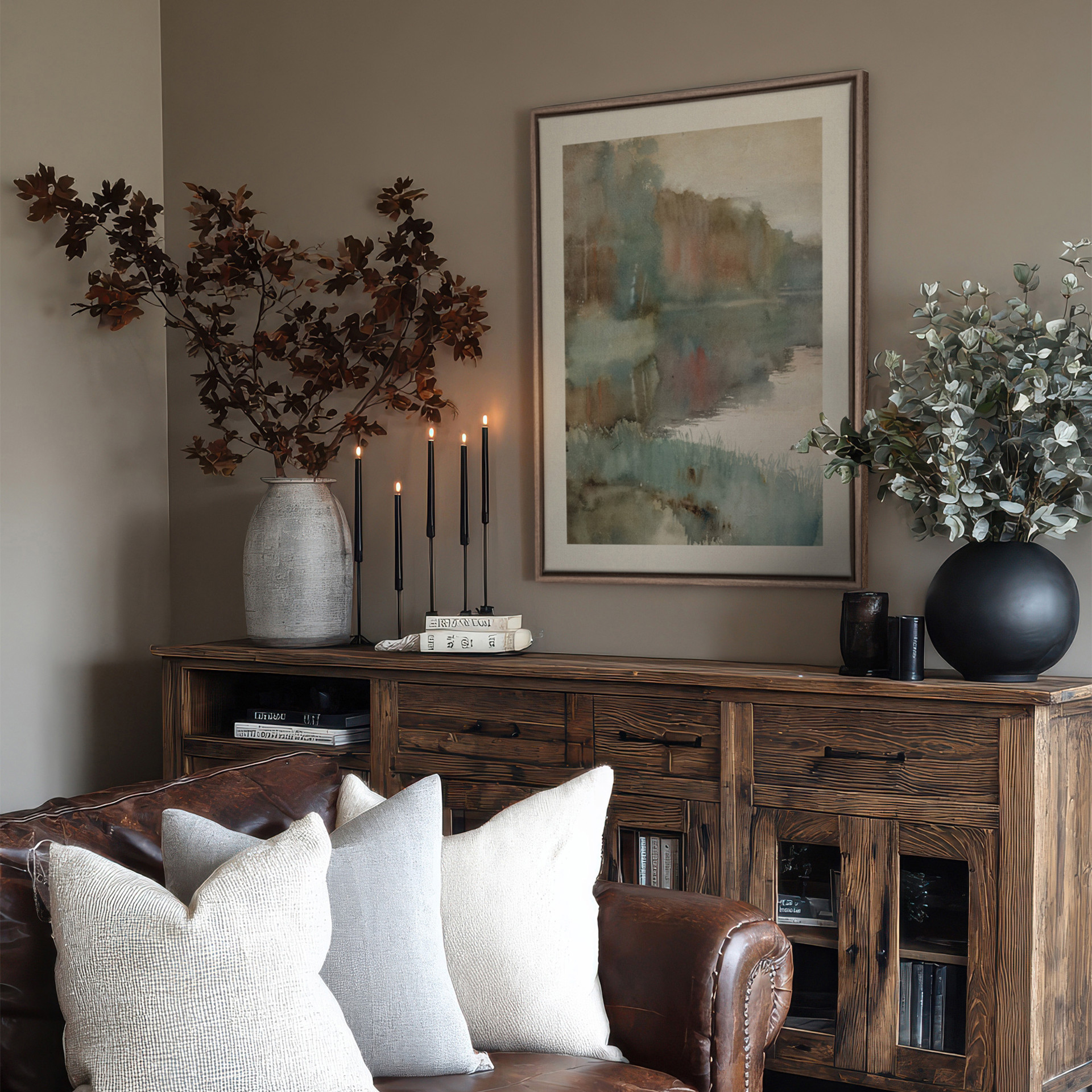 Dans des tons aquarellés de bleu et de brun, Écho du Lac reflète la tranquillité d'un plan d'eau en automne.