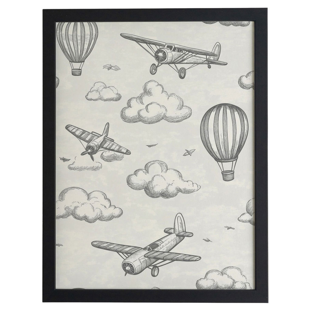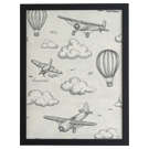 Avions rétro, montgolfières et nuages dessinés avec finesse se déploient dans un univers monochrome à la fois doux et stimulant.