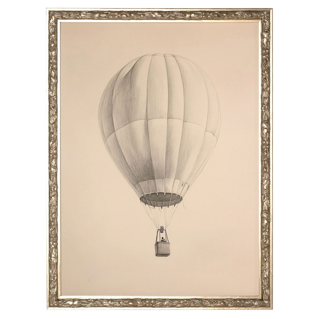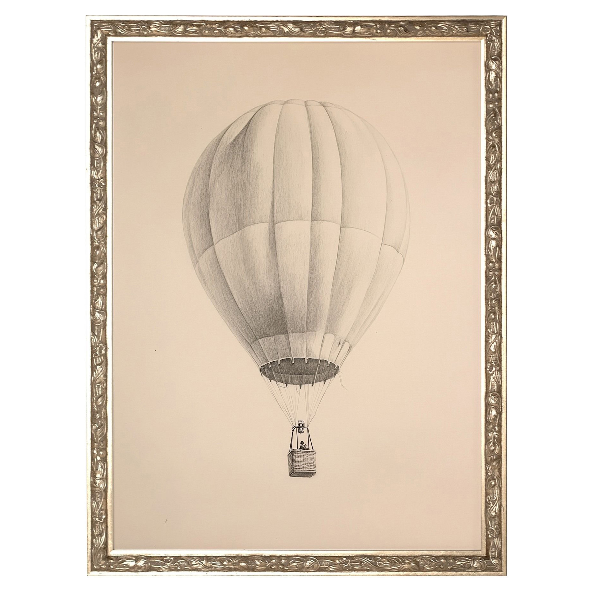 Cette toile rigide illustre une montgolfière dessinée au crayon avec finesse, évoquant la liberté et l'évasion.