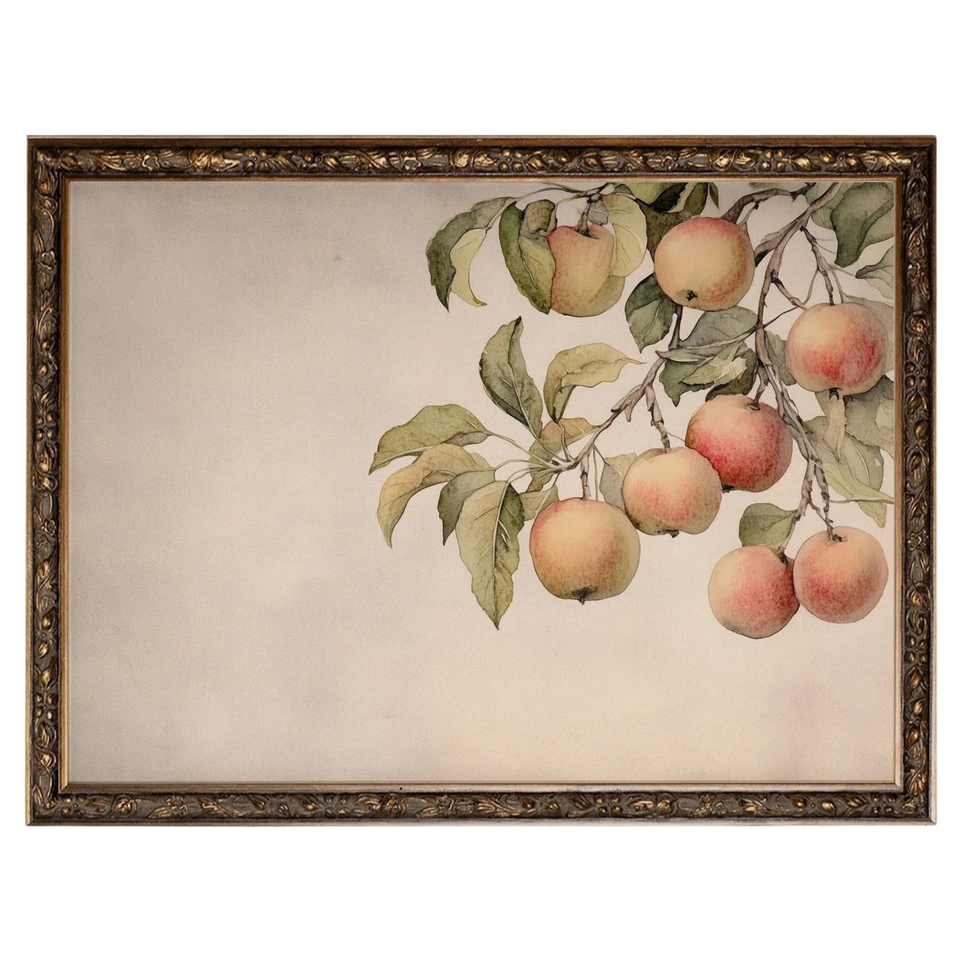 Cette toile rigide en cadre vintage bronze illustre la beauté intemporelle d'une branche de pommier, avec ses pommes mûres prêtes à être cueillies.