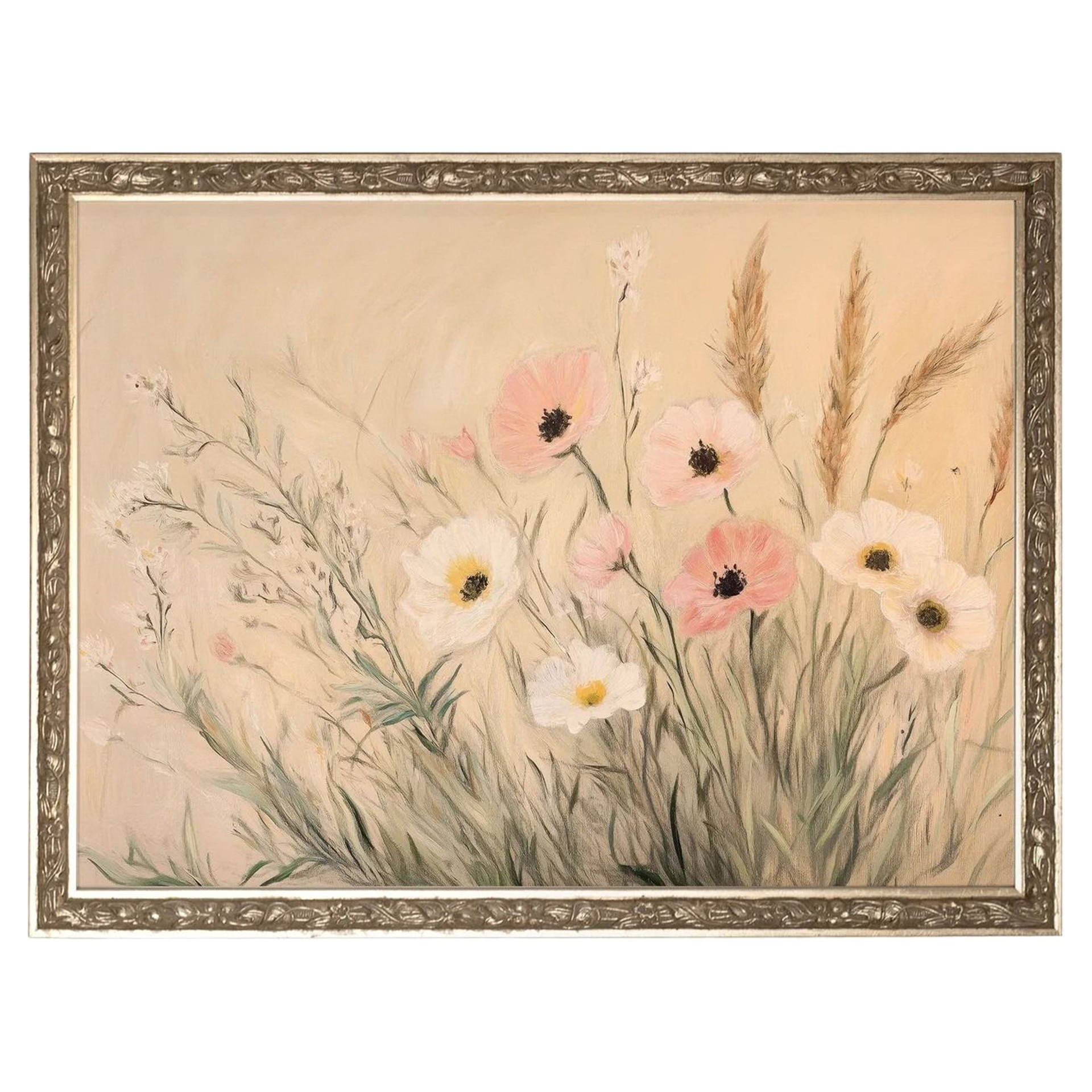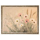 Cette toile rigide capture la douceur d'un bouquet champêtre, où coquelicots roses et fleurs blanches dansent au gré du vent.