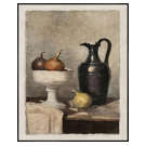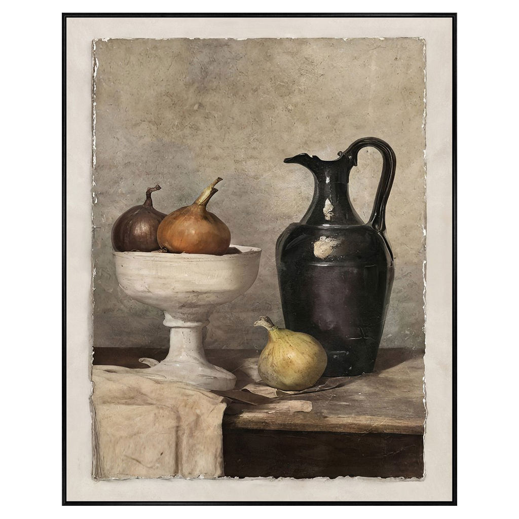 Cette nature morte soigneusement composée révèle un pichet sombre, des oignons et une coupe sur pied reposant sur une table de bois, le tout traité avec une finesse artistique rappelant les tableaux d’atelier d’autrefois.
